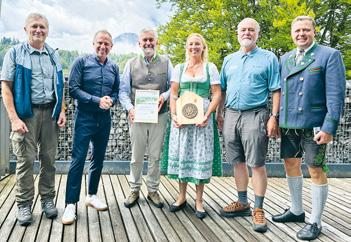 Dr. Roland Baier (M.) bei der Überreichung des Umweltgütesiegels mit DAV-Vizepräsident Ernst Schick, Staatsminister Thorsten Glauber, der Sektionsvorsitzenden Gabi Schieder-Moderegger, DAV-Präsident Roland Stierle und MdL Michael Koller (v. l. n. r.).