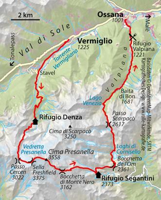 Auf der anderen Seite geht es weglos bergab. Dann wird der Steig deutlicher und führt zum Lago Venezia. Weiter westlich des Westufers nach Norden, wobei Bäche übersprungen werden. Dann folgt man dem Tal nach Nordosten. Über eine Waldstufe zur Baita di Bon und weiter zu einer Wiese mit erneuter Bachquerung. Man folgt weiter dem Tal und erreicht eine Brücke, hinter der es über die Wiesen des Val Piana zum gleichnamigen Rifugio geht. Dahinter folgt man ein Stück der Straße und kann rechts in den beschilderten Fußweg nach Ossana abzweigen. Von dort mit Bus oder Autostopp nach Vermiglio.