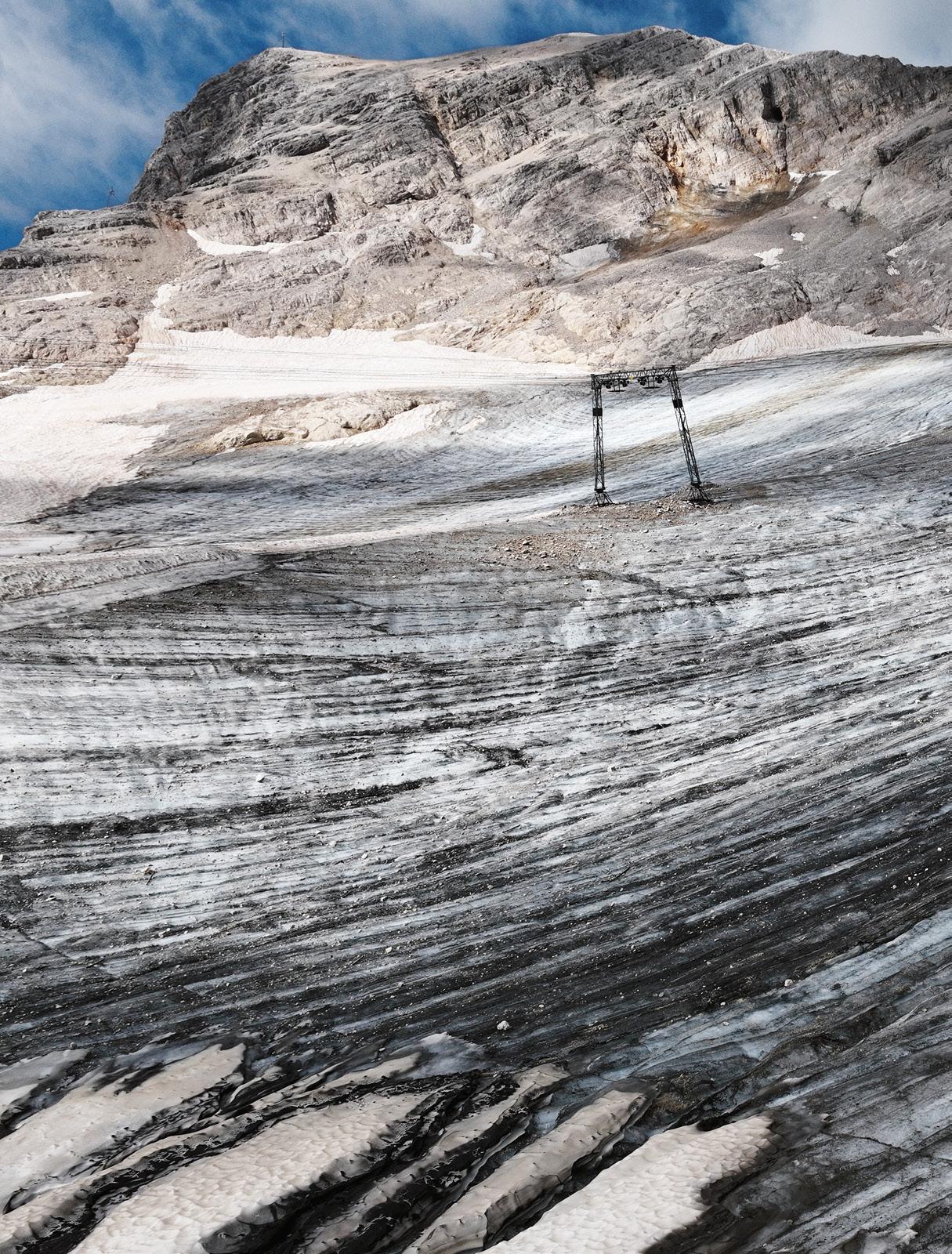 Ein dunkler Rillenteppich, der ein paar wackelig anmutende Schlepplift-Stützen trägt: So sieht Deutschlands höchstes Skigebiet am Zugspitzplatt im Sommer aus. Nach dem schneearmen Winter und einem warmen Frühjahr hat 2022 auch der Saharastaub dem Nördlichen Schneeferner zugesetzt. Mitte August, ein paar Wochen nach der Aufnahme, war auch der letzte Rest Schnee verschwunden. In zehn bis 15 Jahren wird der Nördliche Schneeferner abgeschmolzen sein, der kleinere Südliche Schneeferner hat 2022 bereits seinen Status als Gletscher verloren.