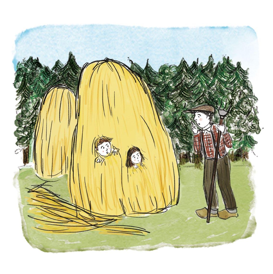I due fratellini corsero più veloce che poterono, finché non giunsero a un prato dove un contadino stava ammucchiando il fieno. «Per favore, aiutateci! I Mat Salvadec ci stanno inseguendo!» implorò Pietro. Il contadino li nascose velocemente sotto due mucchi di fieno. Poco dopo, i Mat Salvadec arrivarono trafelati dove si trovava il contadino e gli chiesero: «Hai visto due bambini?». Il contadino scosse la testa.
