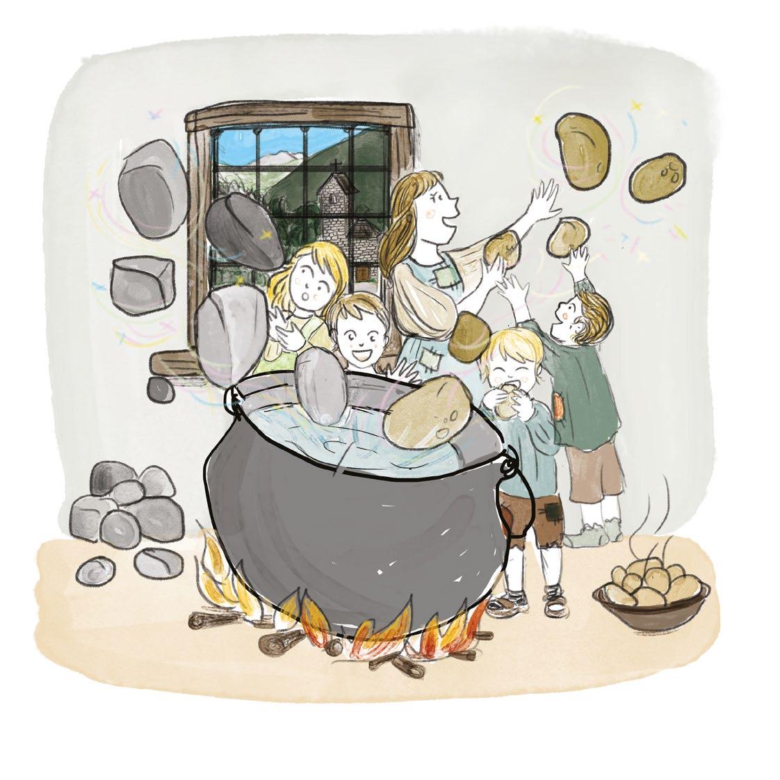 La donna obbedì. Uscì, raccolse alcune pietre grosse e quando l’acqua cominciò a bollire, le mise nel pentolone.