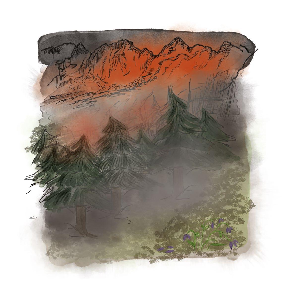 Era quasi arrivato al torrente della Val Terzana quando un vento improvviso cambiò il cielo rendendolo più cupo e sinistro. Il vento era accompagnato da un rumore sordo che solo l’acqua del torrente gli impediva di distinguere nettamente. Quello che il giovane pastore percepiva era un fragore della natura in crescendo, un subbuglio che veniva dal cuore della terra. Poi il fuoco! Si sentivano i rami dei pini bruciare e ardere all’impazzata.