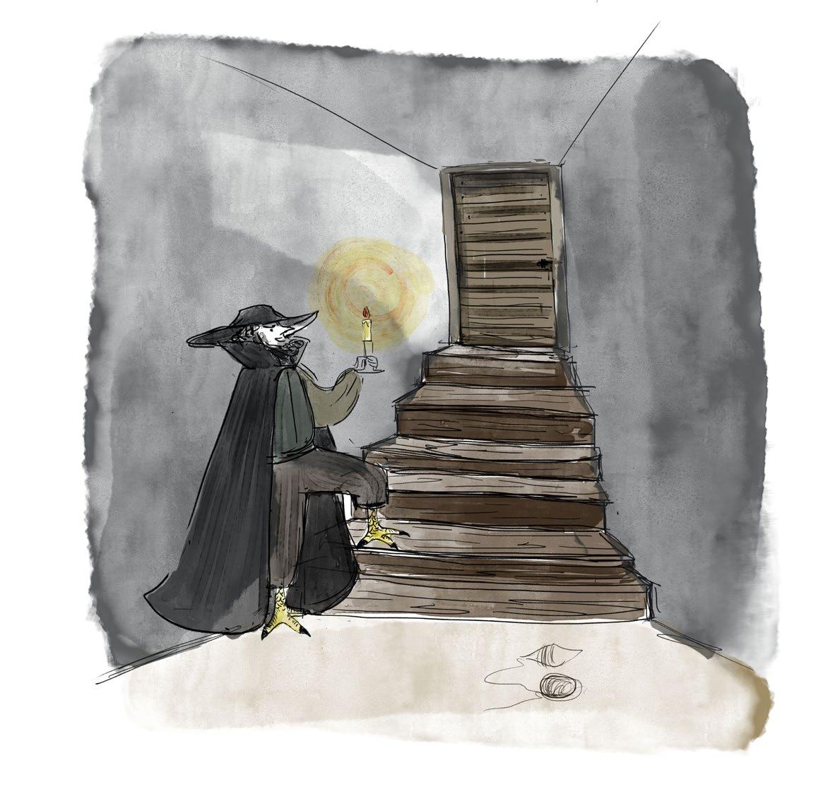 Caterina era agitatissima. Quell’uomo dalle zampe di gallina emanava lo stesso odore della legna che ardeva nel camino. E a dire il vero, da quando era comparso sull’uscio di casa, le era sembrato che la fiamma del camino si fosse ravvivata da sola, come quando le si soffia sopra per farla bruciare con maggiore intensità e vigore. Aveva paura per i suoi figli che, ignari, già dormivano al piano superiore. Allora disse allo sconosciuto: «Signore, vado a prepararmi». «Bene» – disse quello compiaciuto – «la aspetto qui, allora». E Caterina salì di sopra dove dormivano i suoi tre figli, chiudendo a chiave la porta dietro di sé.