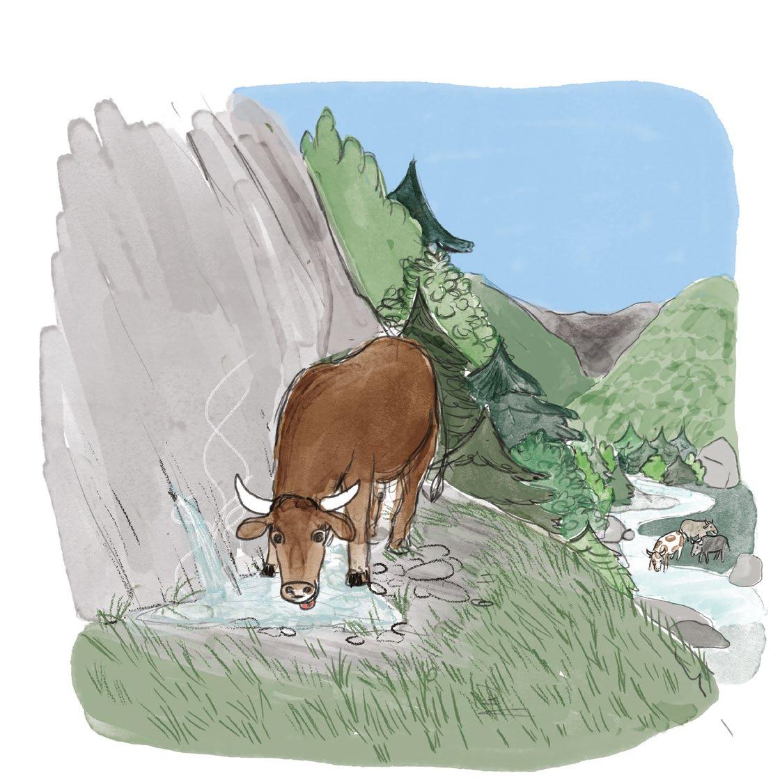 Un pomeriggio, per far luce su questo mistero, incoraggiato anche dagli altri pastori a cui aveva raccontato il fatto, decise di seguire la mucca mettendosi in cammino dietro di lei. La mucca lo condusse attraverso il bosco, che finiva a ridosso della parete rocciosa della montagna. Lì l’animale si fermò e iniziò a bere avidamente dell’acqua che sgorgava dalla roccia. Il pastore si chinò, toccò l’acqua e con grande meraviglia scoprì che si trattava di una fonte di acqua calda.