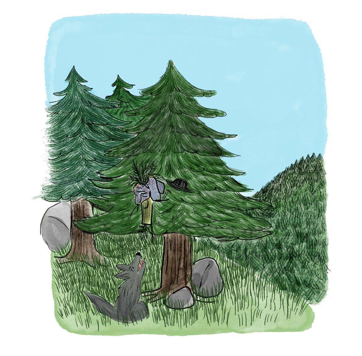 L’uomo non sapeva cosa fare ma ad un certo punto gli venne un’idea. Si tolse la giacca, la cintura e i pantaloni e li riempì velocemente con rami di pino. Così facendo, creò un pupazzo che lanciò sotto l’albero, in pasto al lupo.