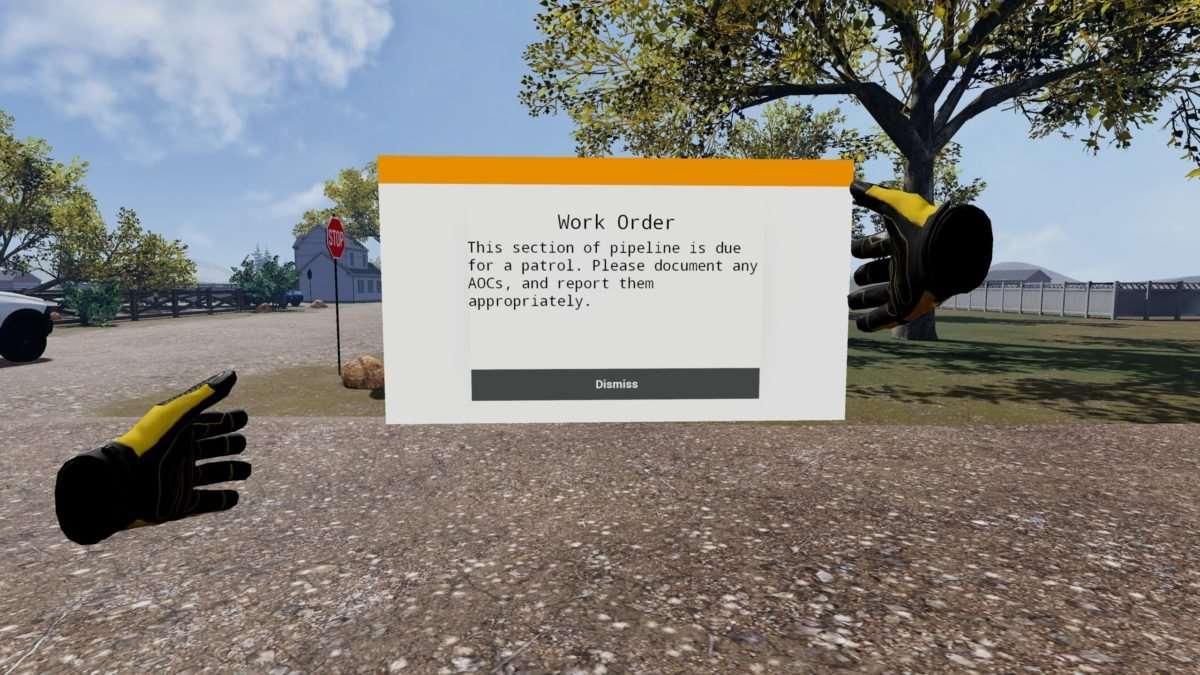 Participants in this virtual reality scenariowillhaveaccesstoasimulatedneighborhood,whereacustomer has reported they smelled gas. The VRuserwillstartwiththeworkorder,thenwillberequiredto investigate outside dwellings and buildings. environment to identify and rectify anyhazards,leaks,orincorrec warnings. They will be tested on gettingCGIreadingsatmainline