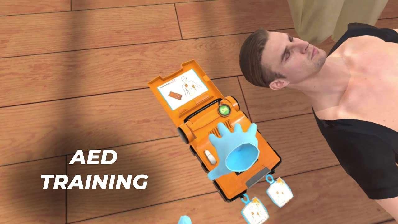 This automated external defibrillatorVRtrainingcourseprovidescriticalfirstaidknowledgefor corporate first responders to safelyhandlesuddencardiacarrest.TheVRtechnologyprovides training to use a defibrillator thatsatisfiestherequirementsforAEDcertification.Thisfirstaid skills training and practical assessmentincludes:
