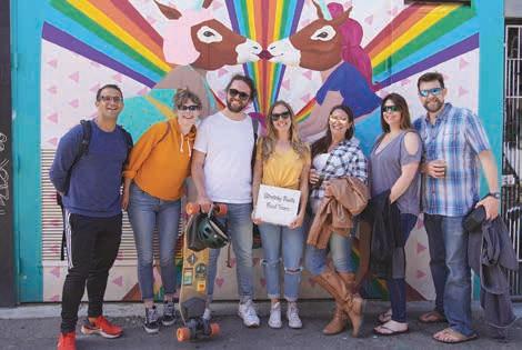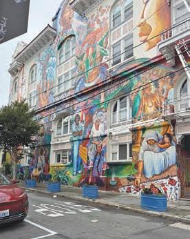 Next on the trail is the awe-inspiring Clarion Alley, where murals dominate an impressive oneblock long alley and you truly “feel” the Mission. The mission (no pun intended) of the Clarion Alley Mural Project (CAMP), in its own words, “is to support and produce socially engaged and aesthetically innovative public art. It uses public art as a means for supporting social, economic, racial, and environmental justice storytelling.” Over 900 murals have been created since 1992, turning this into a must-see Mission destination. The titles of the murals say it all: Hire Trans Folks by Marcel Pardo Ariza, Not in Our Name by Genny Lim and Juana Alicia, and Together, We Can Weather Any Storm by the SF Poster Syndicate, among many others.