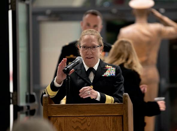 On November 5, BSoR unveiled the Ed Mugford Hall of Valor in the McMurtrie-Reynolds Pavilion, commemorating all Benedictine and Saint Gertrude alumni, faculty, and staff who have faithfully served our country. Shown is Joan LaFratta Kolenich ’67, saluting the American flag during the singing of our National Anthem performed by Saint Gertrude’s honors ensemble choir.
