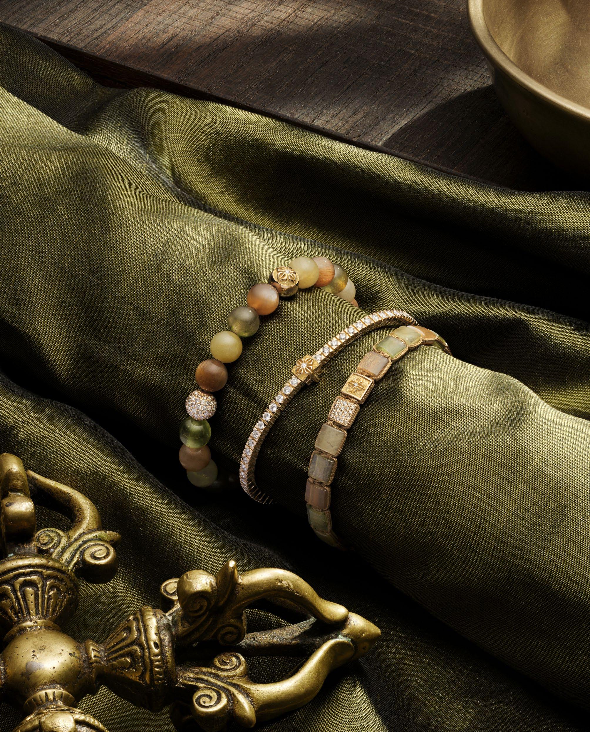 6mm SHAMBALLA® Lock & 8mm Non-Braided Bracelet | Brown & G/Vs Diamonds, Green & Yellow Sapphires, Light Brown Moonstones, 18K Yellow Gold Alliance Bangle | G/Vs Diamonds, 18K Yellow Gold