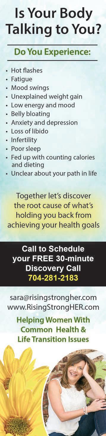 For more information, to make an appointment or arrange for initial free consultation, call 704-281-2183, email Sara@RisingStrongHER.com or visit www.RisingStrongHER.com. See ad, page 9.