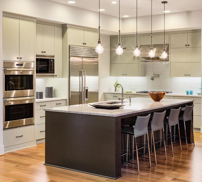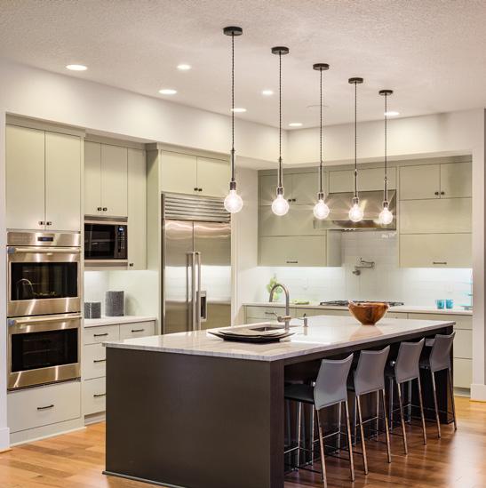 Gleaming countertops and translucent light fixtures allow natural light to bounce around the kitchen, adding to the home's bright and open feel.