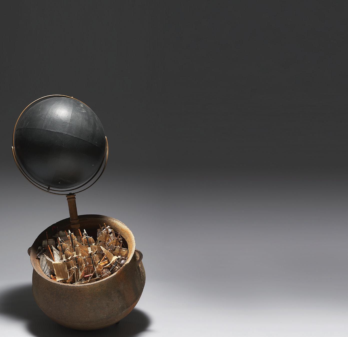 Lonnie Holley, American, born 1950, What Was Beyond Us (The Ocean of Our Thoughts), 2019, globe and stand, model ships, rocks, earth, moss, and cast iron pot, 40 1/2 × 19 in. (102.9 × 48.3 cm). Ackland Art Museum, University of North Carolina at Chapel Hill. Promised Gift of John A. Powell ’77, L2020.10.1a-o. © 2023 Lonnie Holley / Artists Rights Society (ARS), New York.