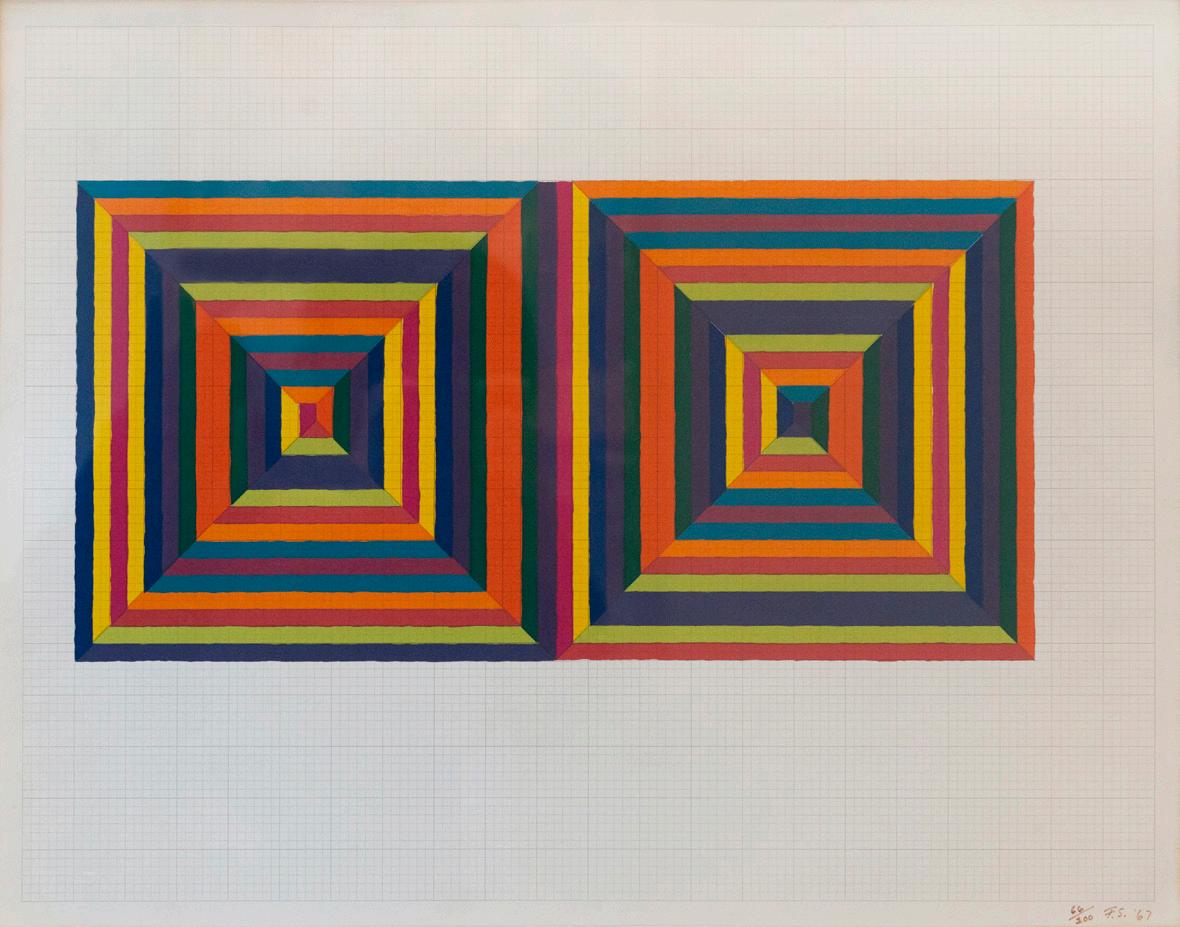 The series ‘Paper Reliefs’ is based on the earlier ‘Polish Village Series’ (1971-73) with the use of relief elements to create the geometric structures which pay homage to the complex architecture of Soviet and Polish wooden synagogues from 16th, 17th and 18th century. The present work ‘Grodno (I)’, along with the other five reliefs, was a breakthrough series for Frank Stella – it was the first insinuation of colour into paper and the achievement of relief in his prints.