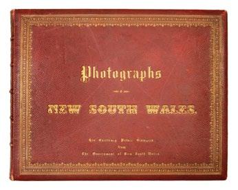 Landscape folio, (album 46 x 36.5 cm.) 70 albumen prints (each approximately 22.6 x 280 cm., or the reverse), mounted on card, recto and verso, each with a printed caption on the mount, some titled in the negative, contemporary red morocco gilt, gilt edges, lightly rubbed, upper cover with gilt tooled presentation “Photographs / New South Wales / for his Excellency Prince Bismarck / from / the Government of New South Wales”.