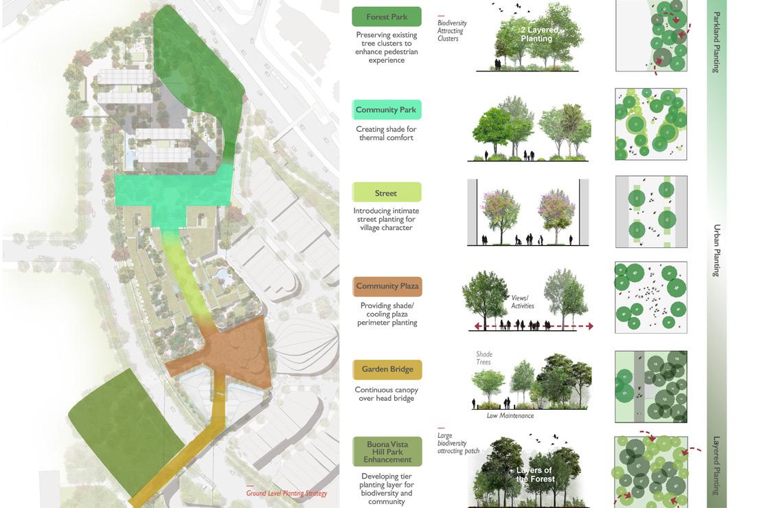 As Singapore continues to grow into a mature and lush City in a Garden, hvHeart incorporates these country-wide aspirations into the next generation of the district scale development by creating a ‘Village in a Garden’. Inspired by the decades of icon roadside planting and flowering species, hvHeart introduces a strong integration of the urban vegetation into the vibrant urban village. The green and blue networks are woven into the development and reach beyond towards neighboring national gardens, parks, park connectors, and tree-lined roads to create a more liveable and biophilic city core. Efforts have been made to conserve elements of natural heritage, such as existing trees and terrain, to establish connections for native flora and fauna. Four key factors of Singapore’s City in a Garden approach have been strategically built into hvHeart: