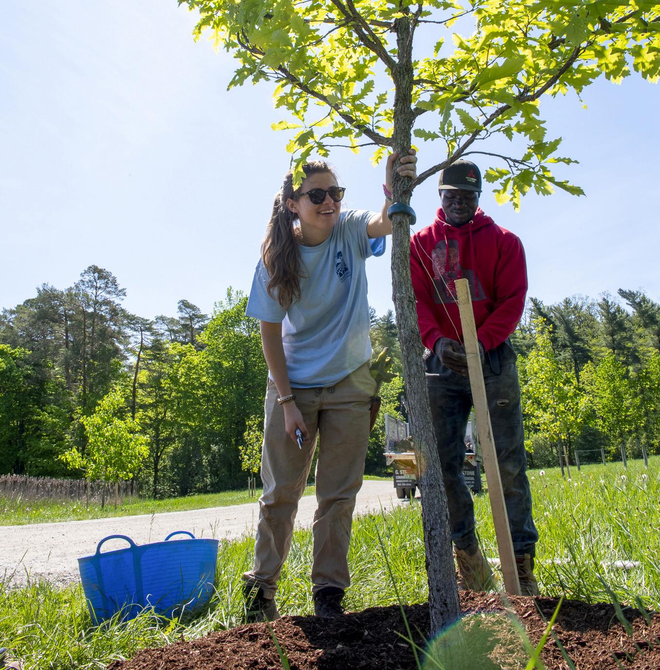 Exterior shingling of the Breeding Barn continued through 2022 (it will wrap up in 2023). Long-time supporters were invited to inscribe messages on shingles used in the project, creating an informal time capsule within the building walls. We honored Frederick Law Olmsted's 200th anniversary by planting trees along historic allees, guided by our Historic Landscape Management Plan. And as we experiment with climate solutions, we began developing our Climate Action Plan to guide our progress towards net zero status by 2028. (photos, p.14-15: Wally Allen, Holly Brough, Caleb Kenna)