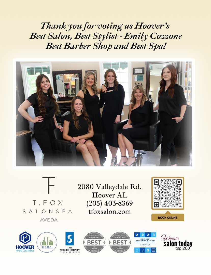 In this issue, readers, you all will also get to learn about Biscuit Belly owner-operators Andrew and Rachel Adams (page 39); Cookie Fix founder Amy Jason (page 48); Hoover residents Aubrey and Jeanne Garrison (page 49); University of Alabama quarterback Jalen Milroe’s football camp (page 59); and our community leaders (page 66). I had the pleasure of interviewing many of these individuals myself, and they all reminded me that the road to success is hardly ever the straight and narrow.