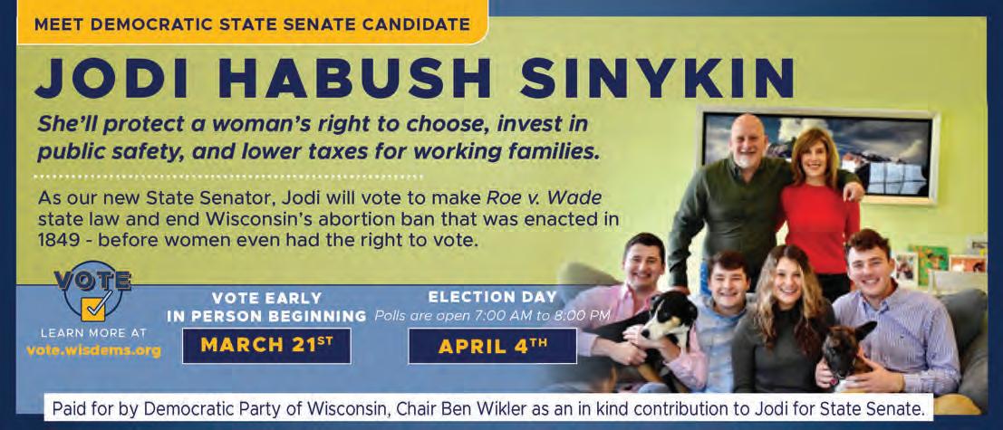 Jodi Habush Sinykin would be a fresh start for the residents of this state senate district. She is strongly prochoice on women’s reproductive issues which is in sync with both her district and the majority of people in Wisconsin. Habush Sinykin was born and raised in the district. Left for college and then Harvard Law School. She declined the highly paid opportunities to join the Wall Street and other East Coast law firms to instead return to Wisconsin to focus primarily on public interest legal work.