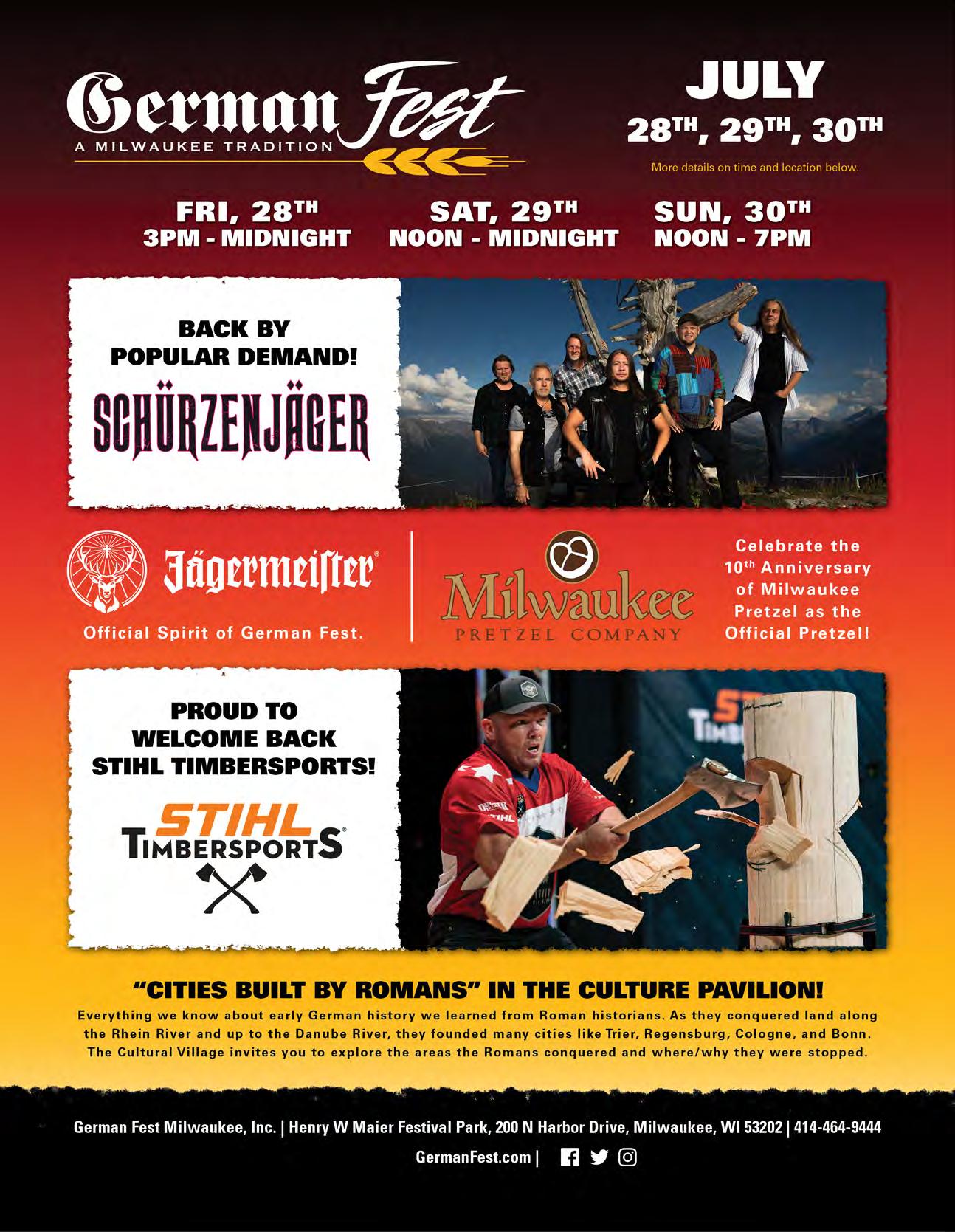 BASTILLE DAYS AT CATHEDRAL SQUARE PARK (520 E. WELLS ST.): This incredible, four-day event attracts more than 250,000 attendees, making it the largest Frenchthemed fest in the country. Take in the food, live entertainment and iconic Eiffel Tower replica, and don’t forget the nighttime “Storm the Bastille” run/walk on Thursday.