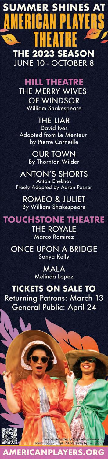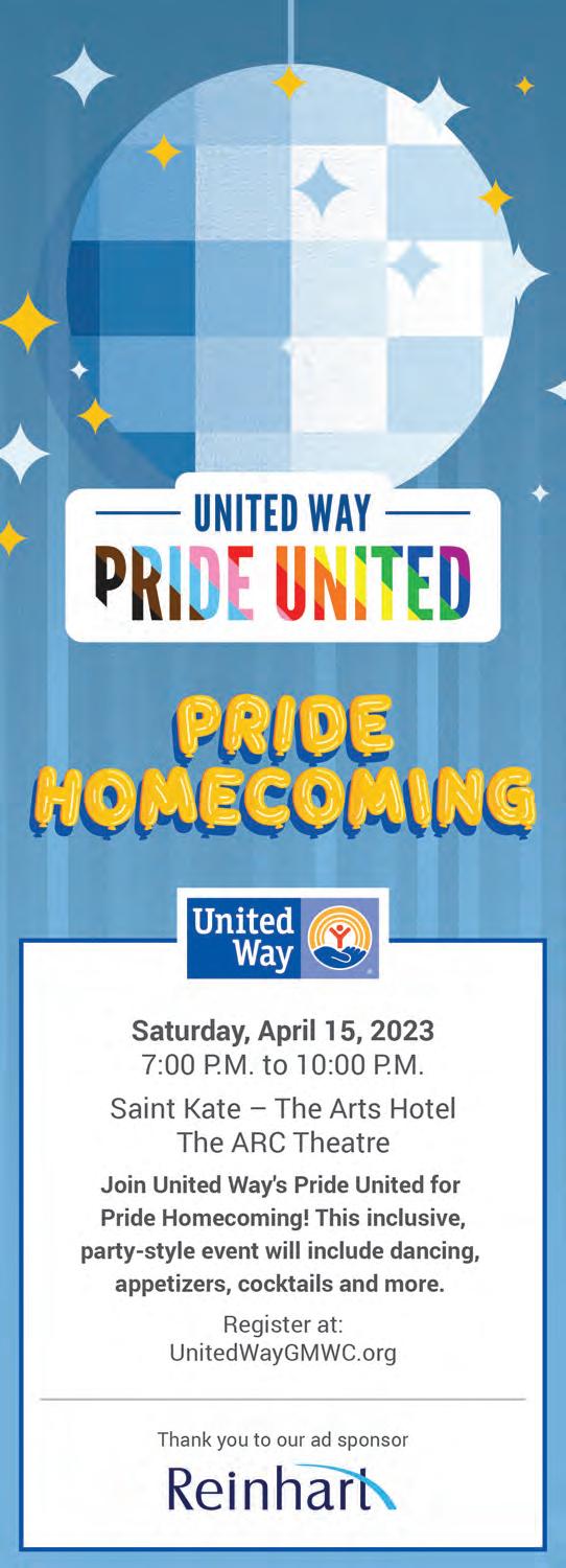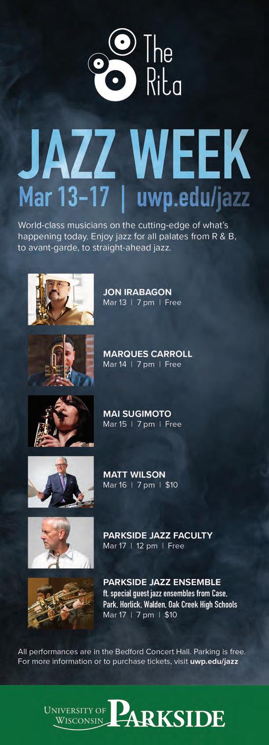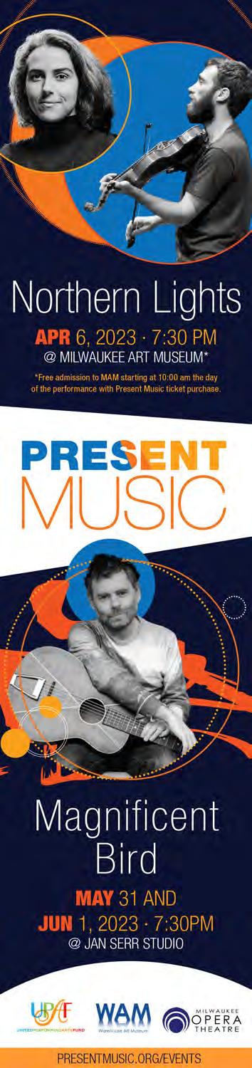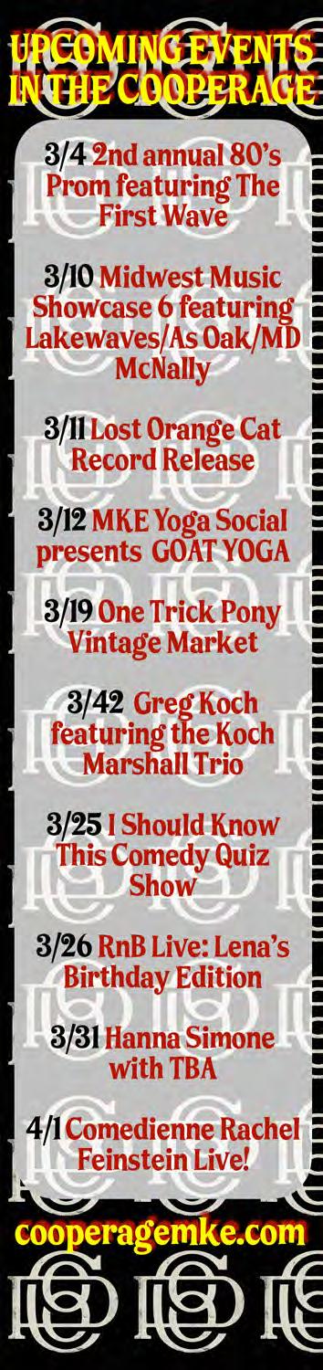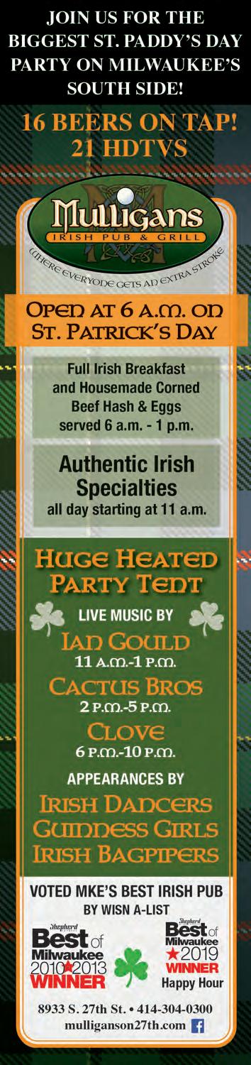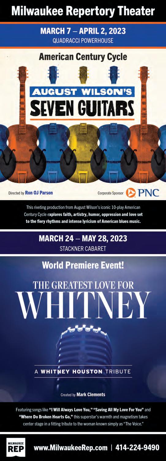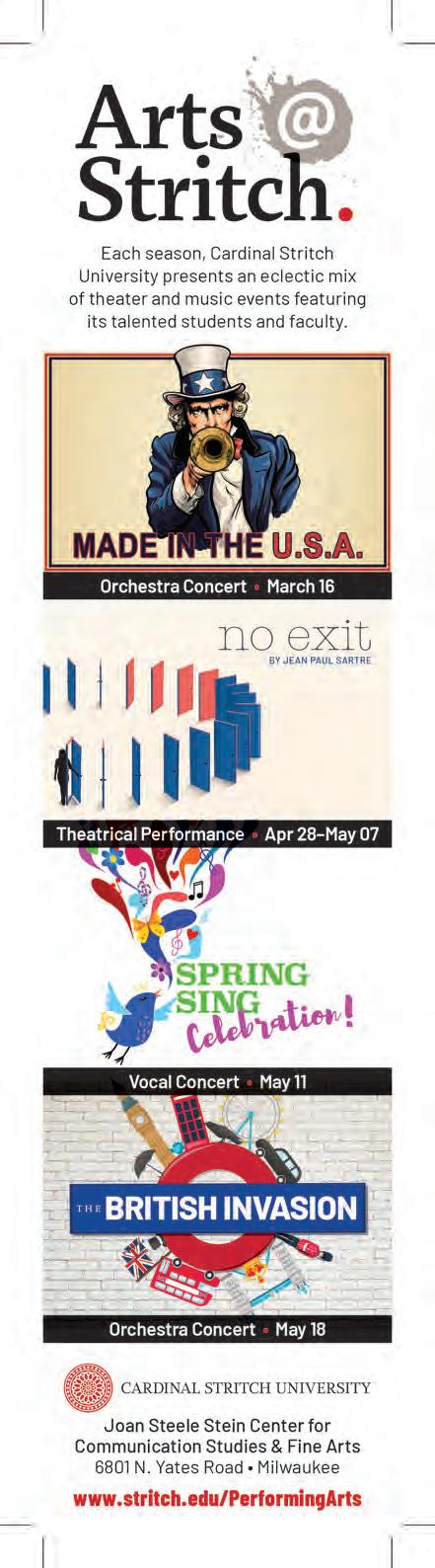 24 NEWS 05 Please Vote on April 4 10 Republicans Still Aren't Ready to Accept Democracy — Taking Liberties 11 This Modern World 12 Overcoming Income Gaps with the Fierce Urgency of Math — Issue of the Month 14 Friendship Circle’s Leah and Levi Stein Address the Need for Mental Health Services — Hero of the Month 16 Shar-Ron Buie on Marquette's Program for People Affected by Incarceration — MKE SPEAKS: Conversations with Milwaukeeans FOOD & DRINK 18 The Bridgewater Modern Grill 20 Make Plov, Not War — Flash in the Pan SPECIAL SECTION 22 Escape to Madison for the Art of It All — Day Trips 24 Spring Arts Guide 47 Home & Garden 47 Starting Garden Plants Indoors 48 Was Your House Purchased Through a Catalog? — Open House 52 Spring Drink 52 A Coffee Guru and a Conversation About Making Espresso at Home — Open House 53 St. Patrick's Day Guide 2023 58 Is Your Pet in Distress? — Pets CULTURE 60 World Premiere Wisconsin Offers an Enticing Menu of New Plays, Musicals 62 This Month in Milwaukee LIFESTYLE 64 Alcohol is Not Your Friend — Out of my Mind HEAR ME OUT 66 Growing Apart... For Jesus — Dear Ruthie 68 The Wrecking Ball may be Coming to the Wreck Room — My LGBTQ POV ART FOR ART'S SAKE 70 From the City that Always Sweeps SPONSORED BY