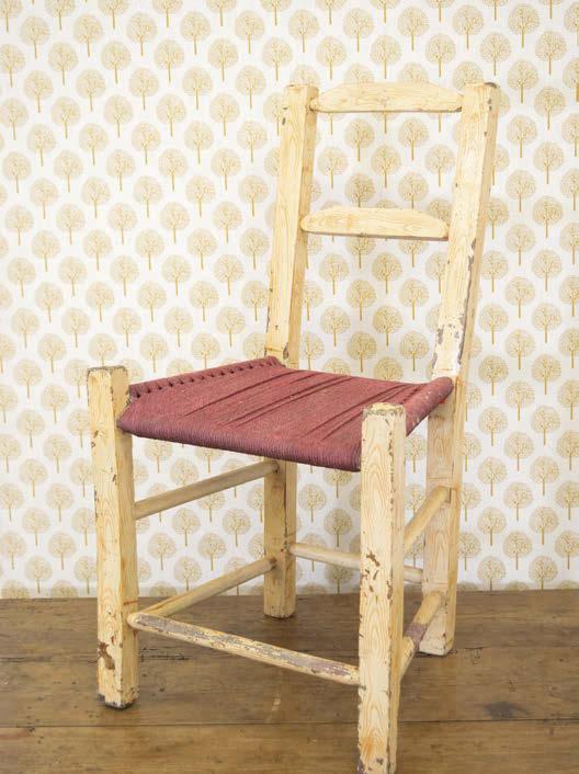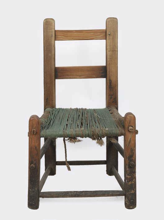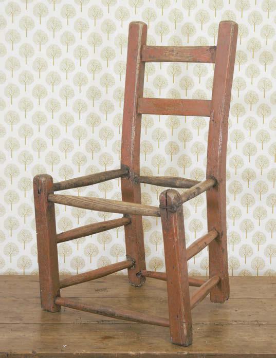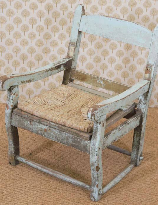 a small, metal-framed chair designed for a child, evocative of mid-century domestic furnishings.