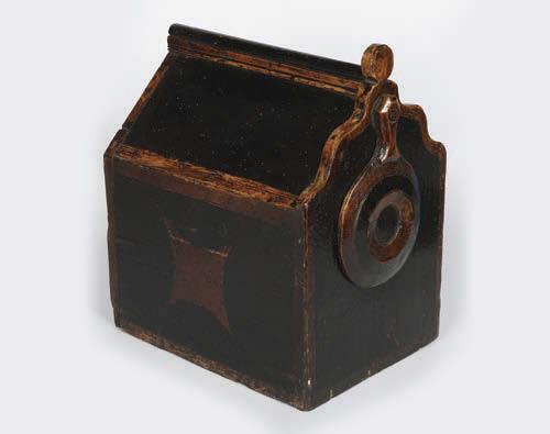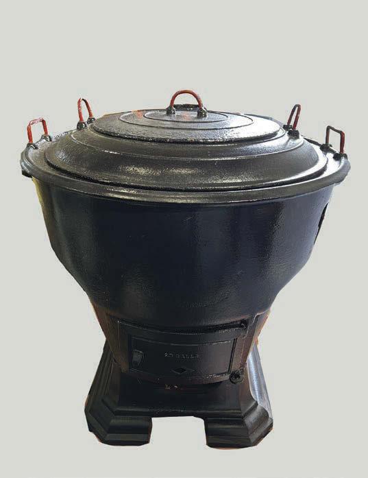 with swing handle and lidded inner bowl; used for heating glue in carpentry and leatherwork.