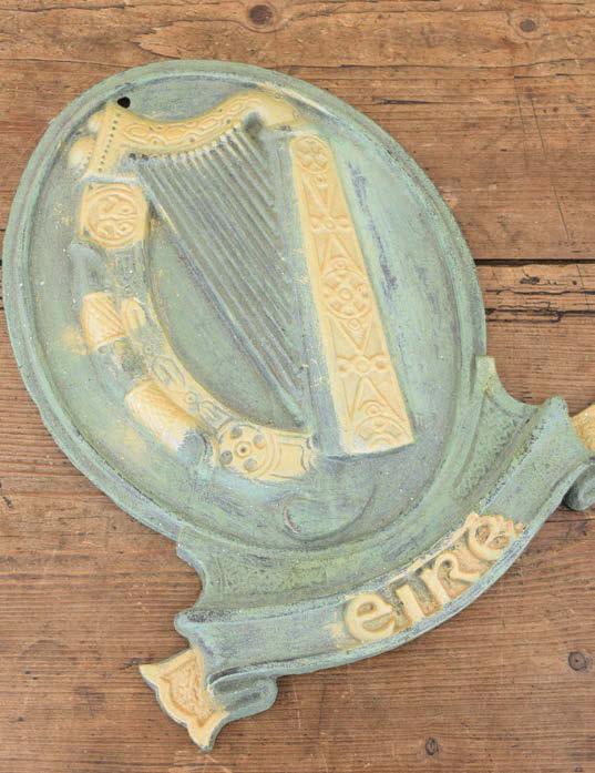 oval in shape, depicting harp and Éire motif; evocative of national identity and pride.