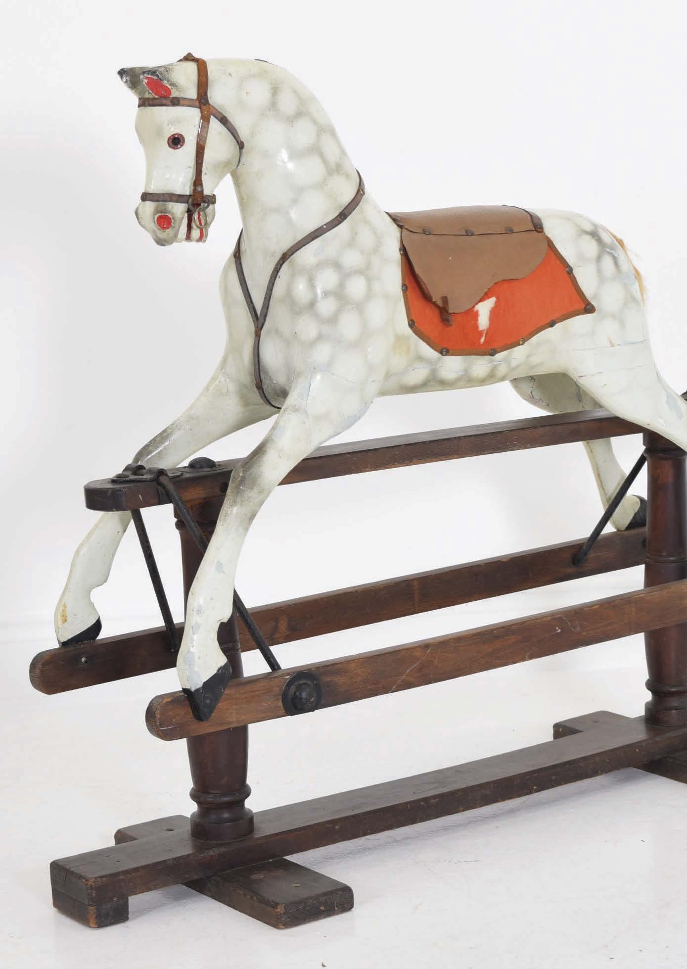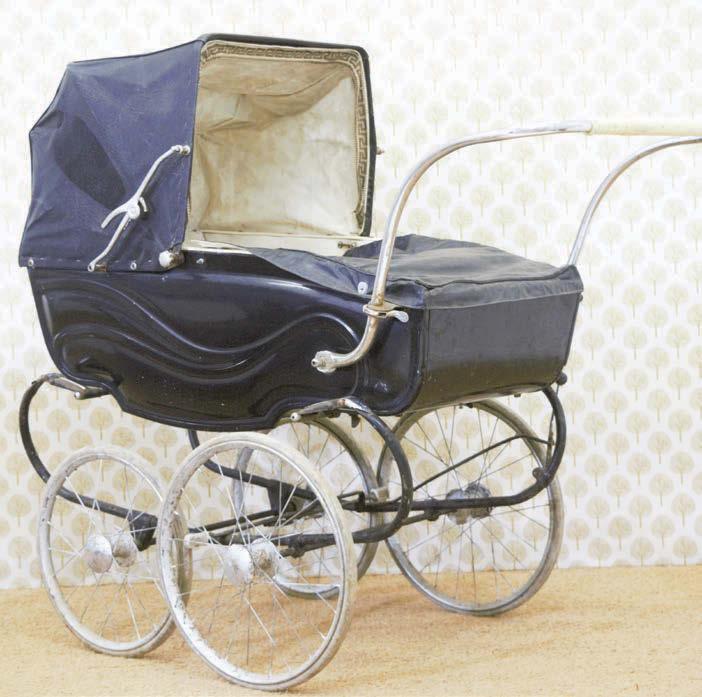 19TH-CENTURY FOURWHEEL CHILD’S PRAM with folding hood and spoked wheels.