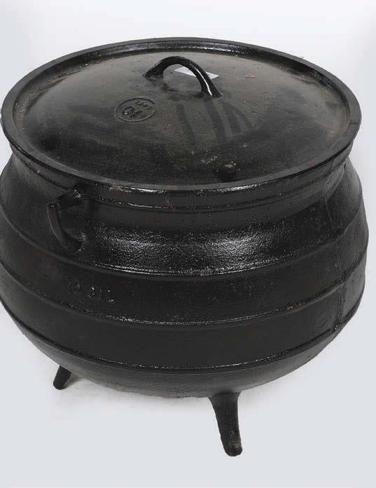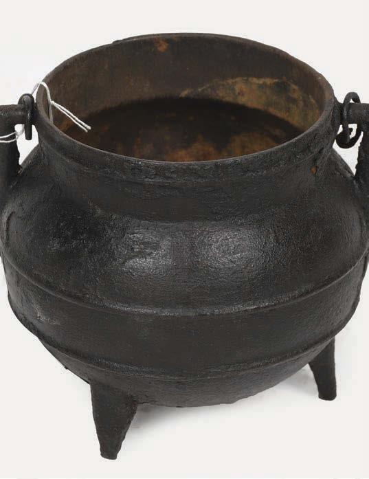 a heavy-duty hearthside cooking pan with deep bowl and extended handle, used for open-fire cooking in rural kitchens.