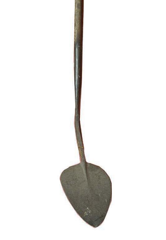 with a worn ash handle and iron scoop; used in coal or metal mining contexts. 90 cm. long