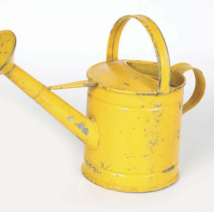 CAN painted yellow, this small watering can was designed for a child, reflecting mid-20th-century domestic gardening practices.