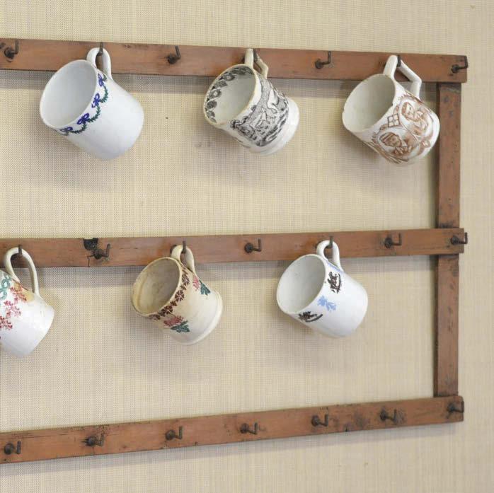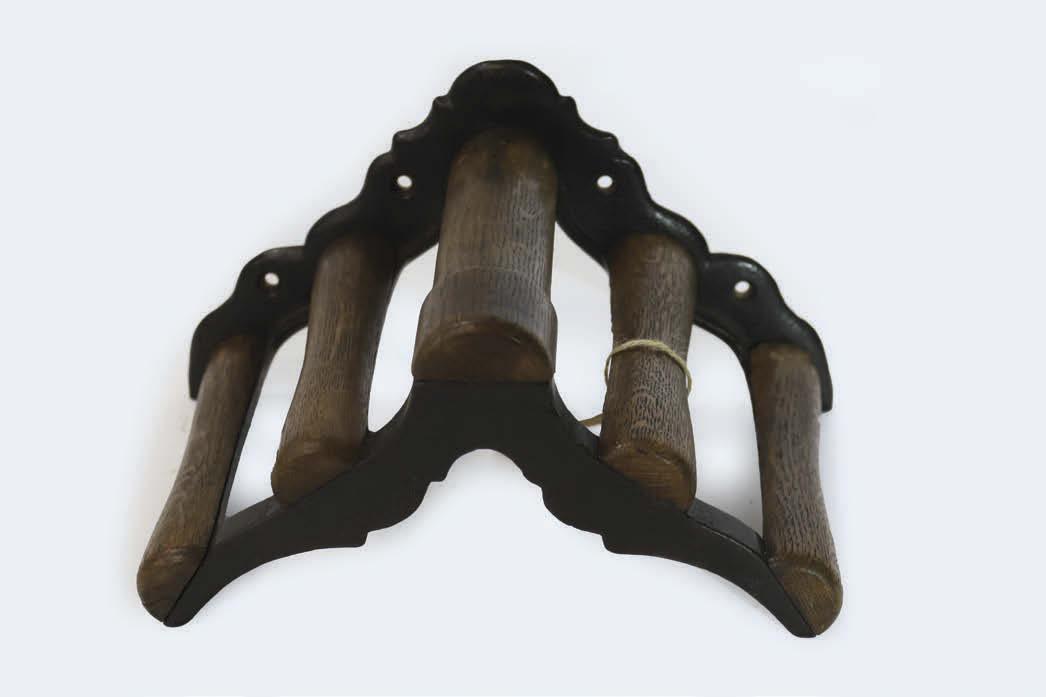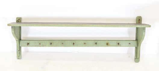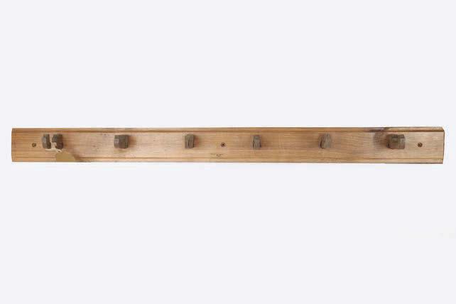a utilitarian wooden rack fitted with iron hooks, designed for organising and storing gardening tools. 8 cm. high; 95 cm. wide; 2 cm. deep