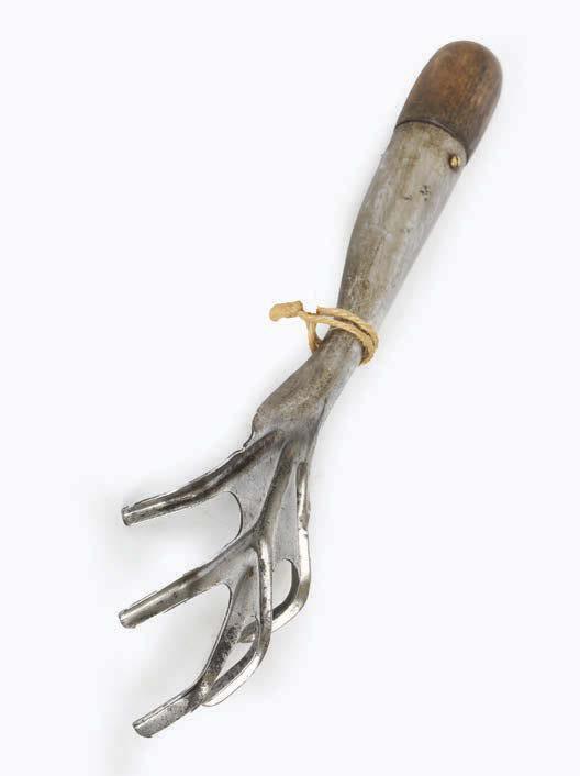 a well-preserved daisy grubber featuring a turned beechwood handle, typical of early 20thcentury garden tools.