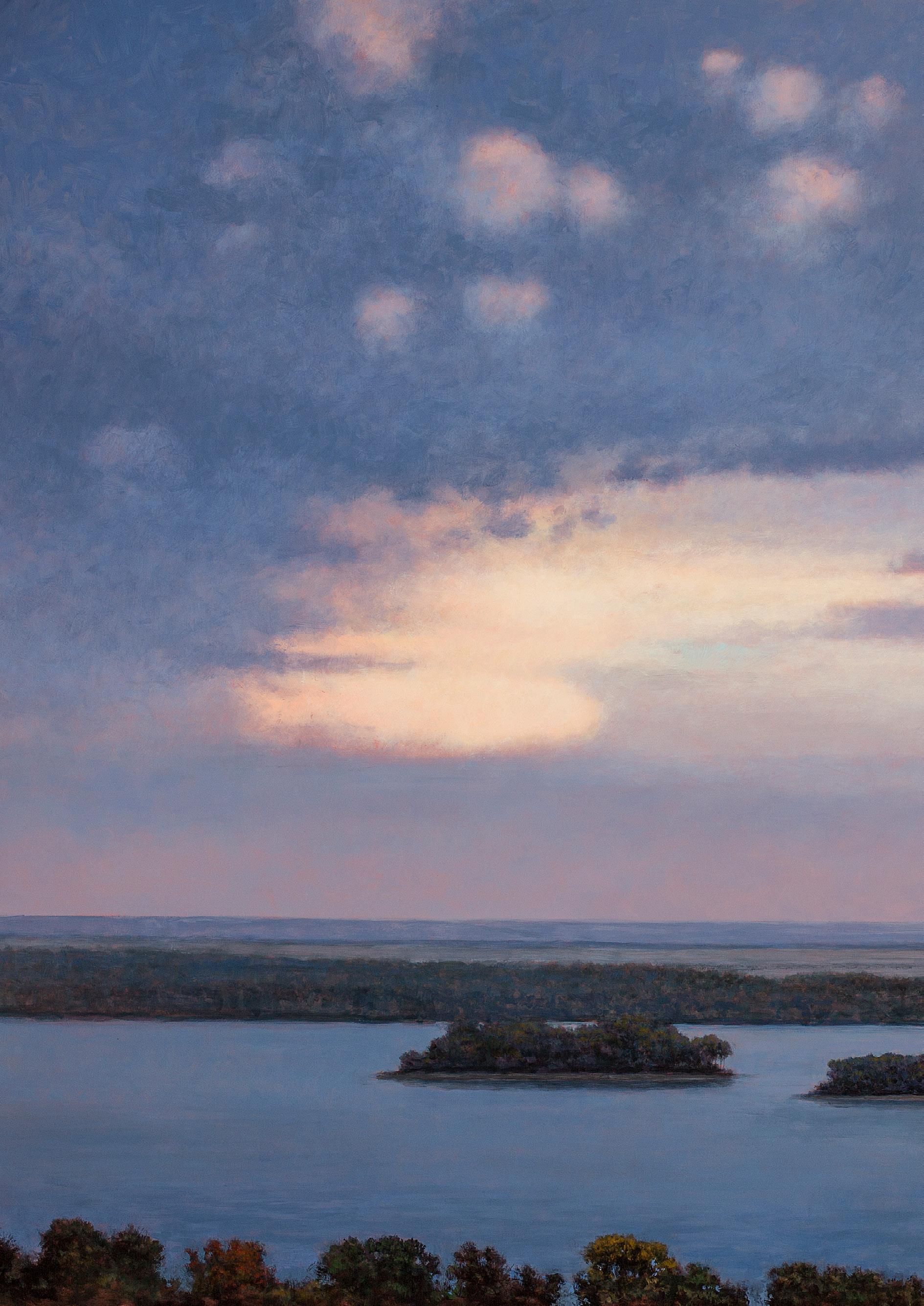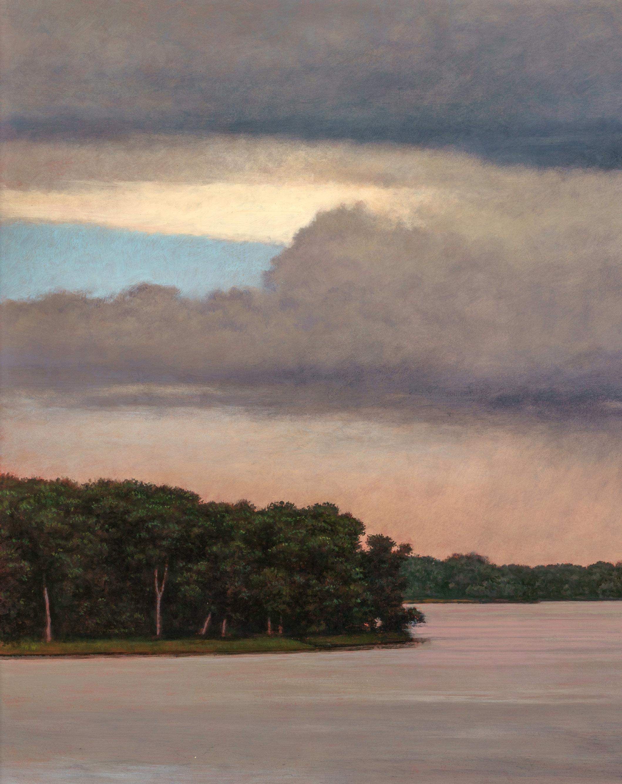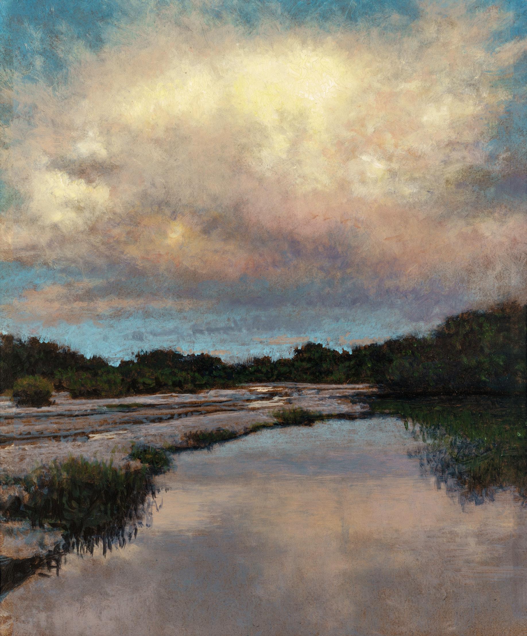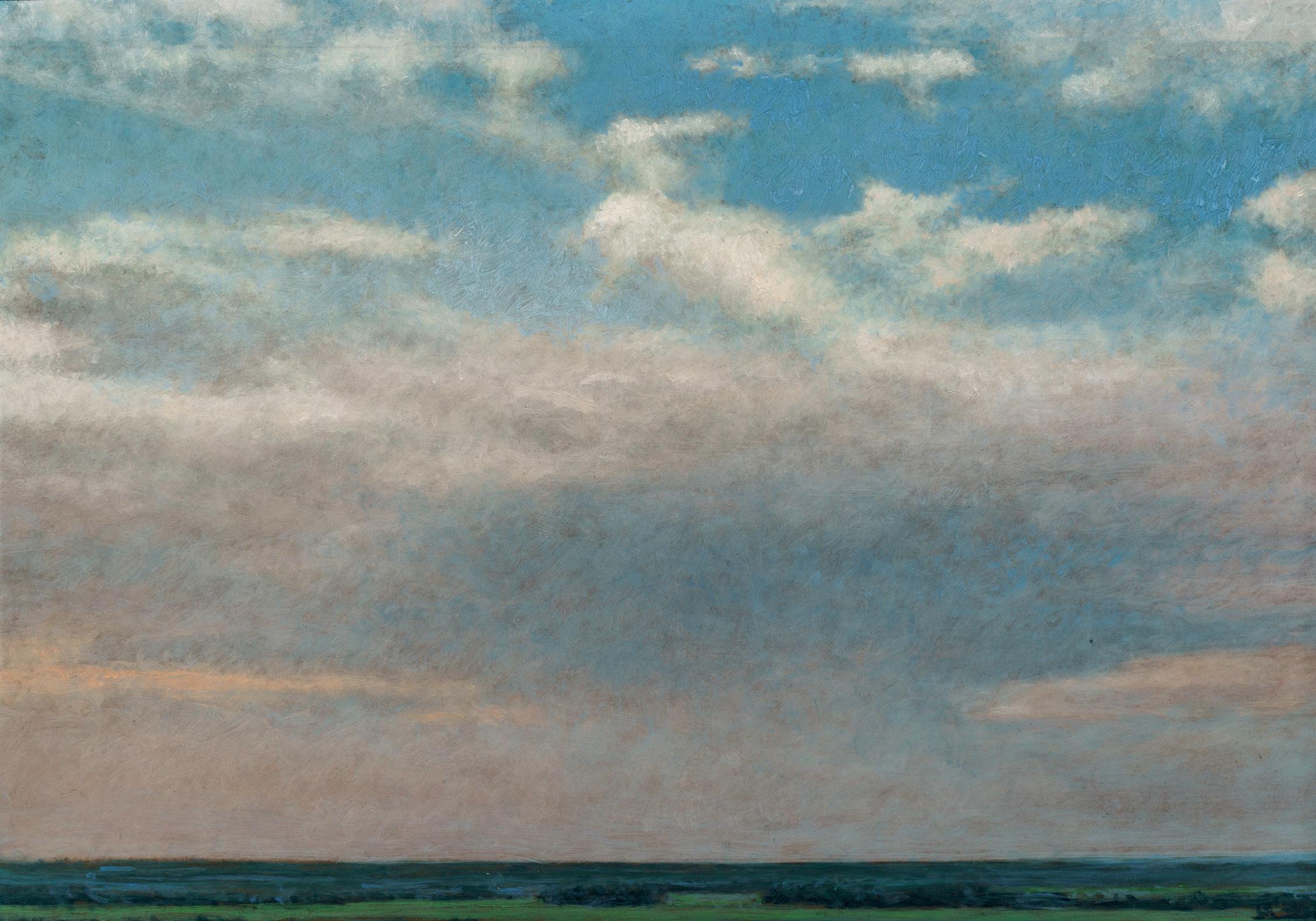 Jeff Aeling’s paintings seem to hold the actual experience of being present in the landscape. They are composed of the vastness of space and the shifting drama of light and atmosphere. The sky often fills over half of the composition and clouds frequently fill the sky. Sunlight and shadow are filtered and reflected on the land and water below to hold a single, unrepeatable moment in time.