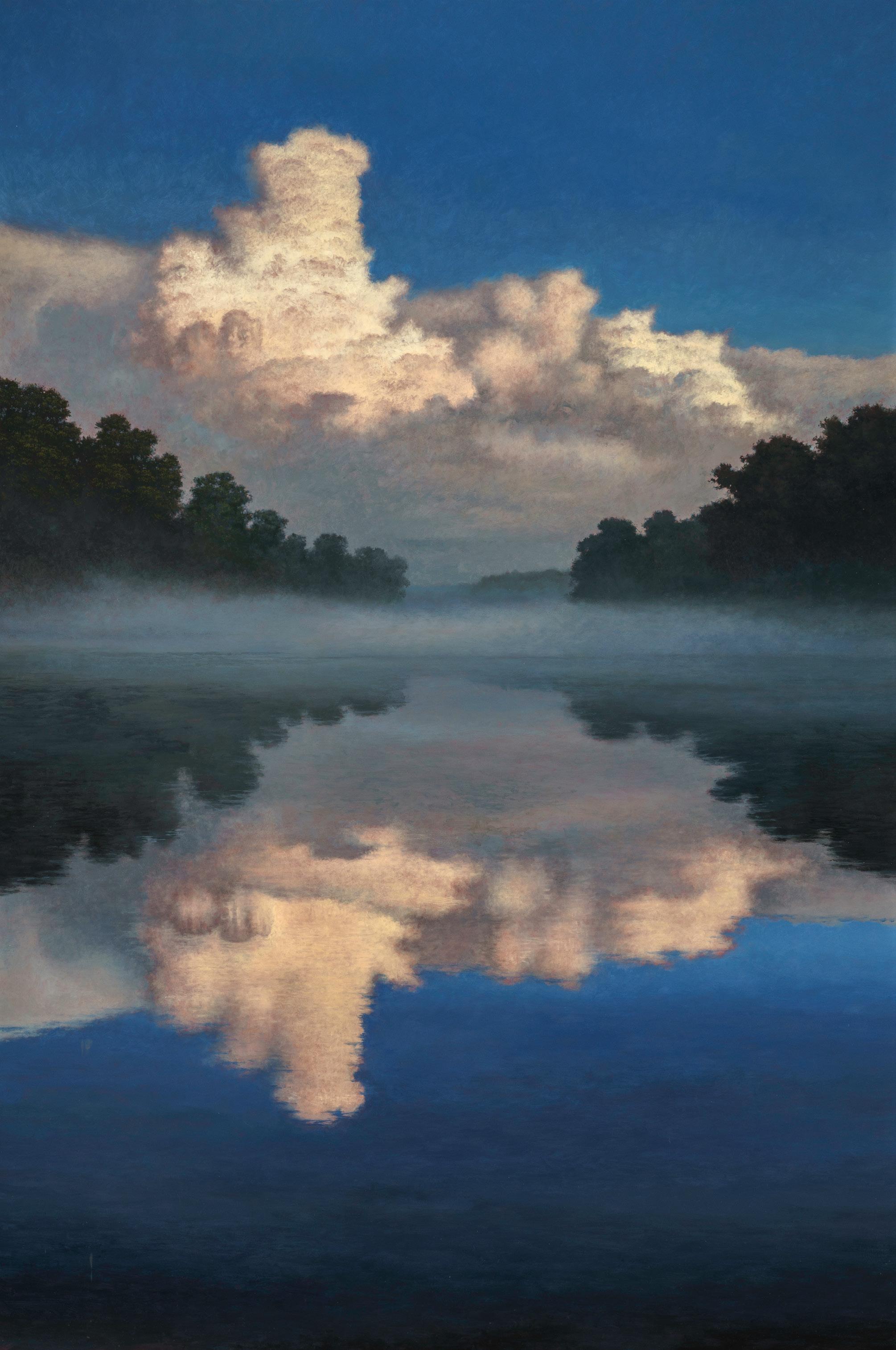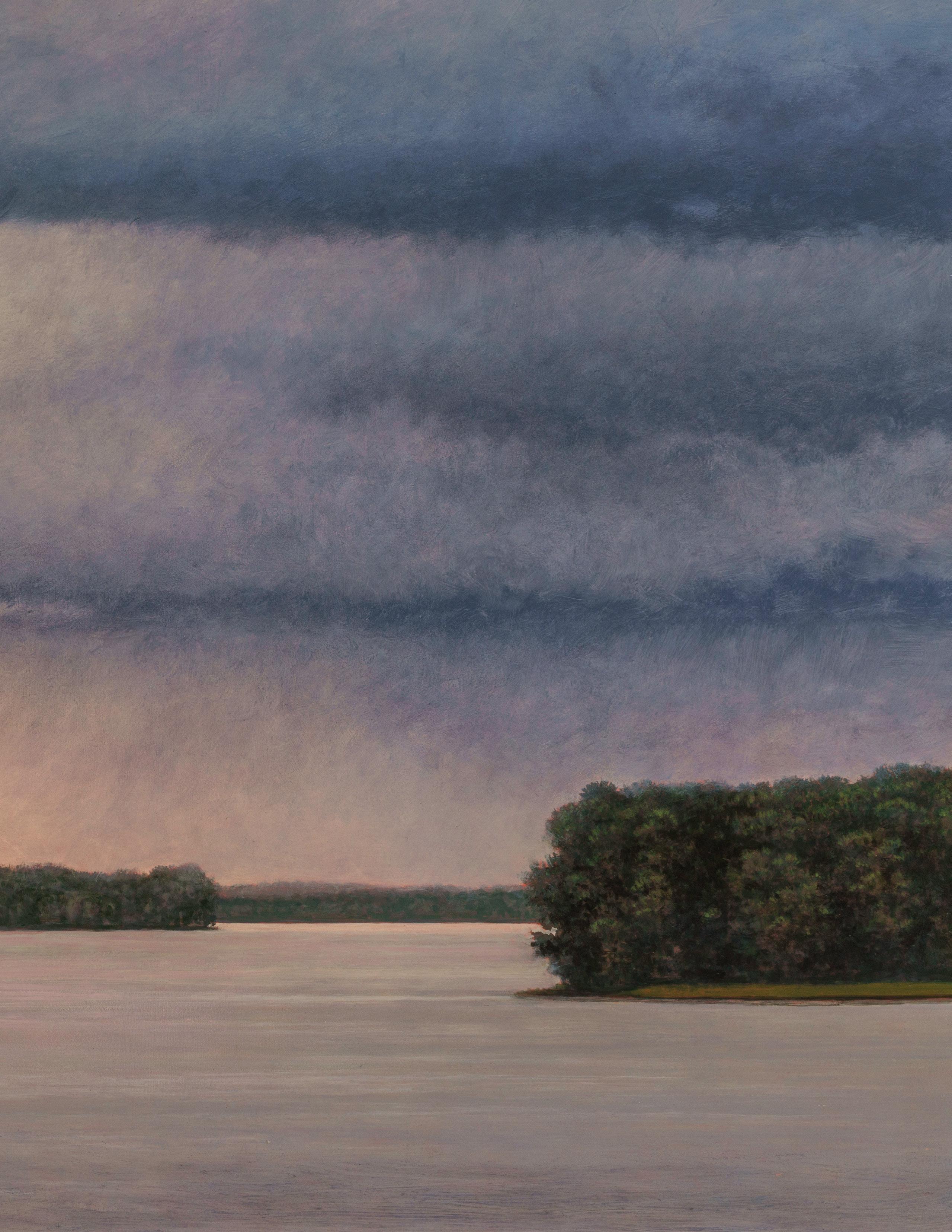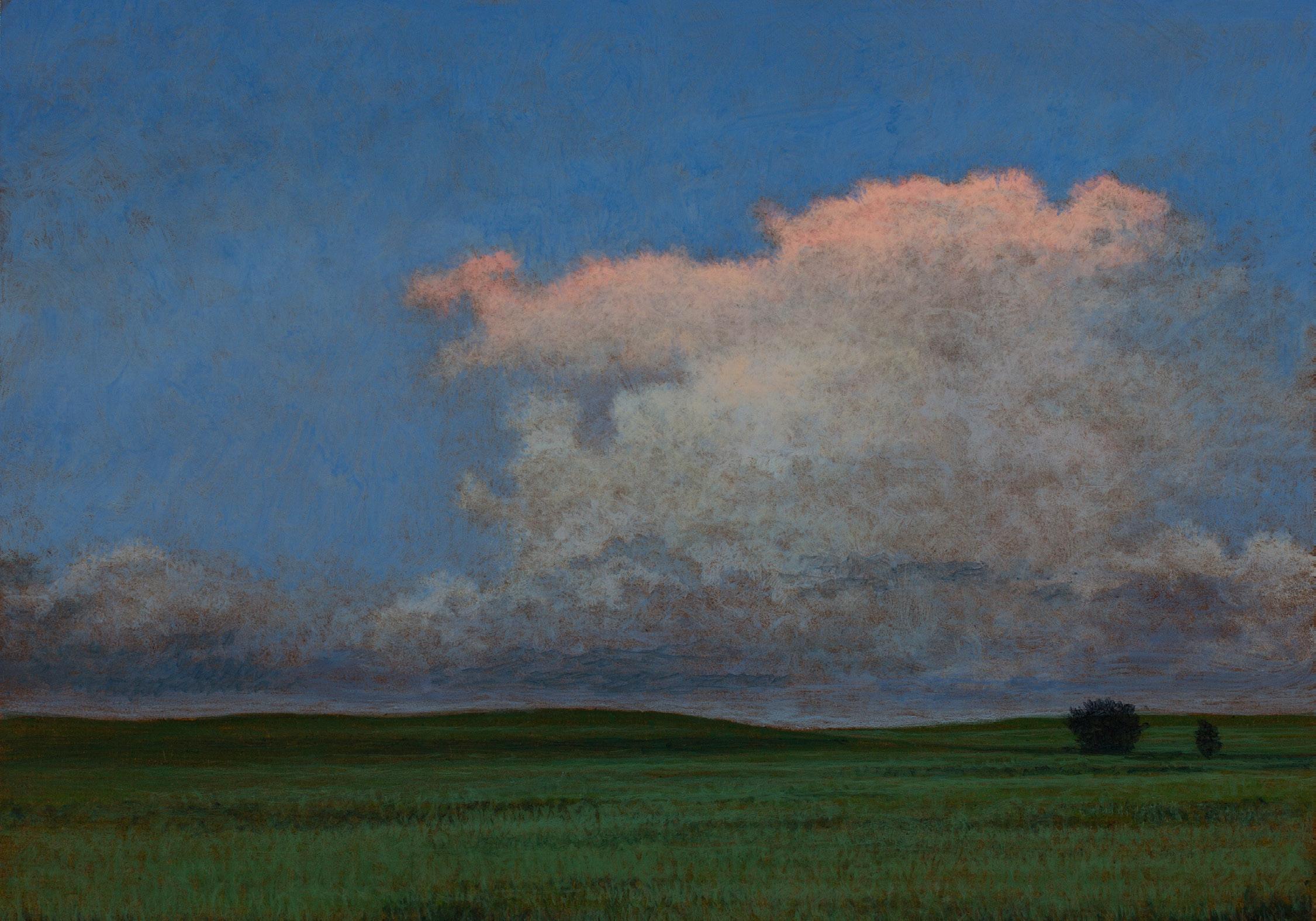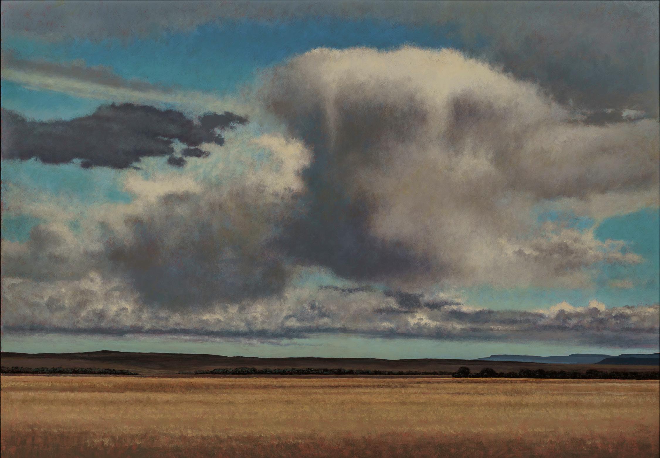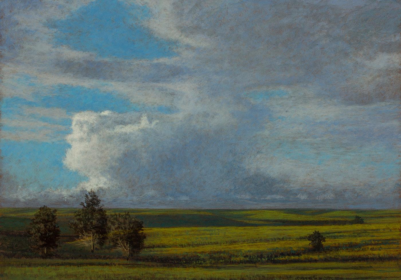 Jeff Aeling’s paintings seem to hold the actual experience of being present in the landscape. They are composed of the vastness of space and the shifting drama of light and atmosphere. The sky often fills over half of the composition and clouds frequently fill the sky. Sunlight and shadow are filtered and reflected on the land and water below to hold a single, unrepeatable moment in time.