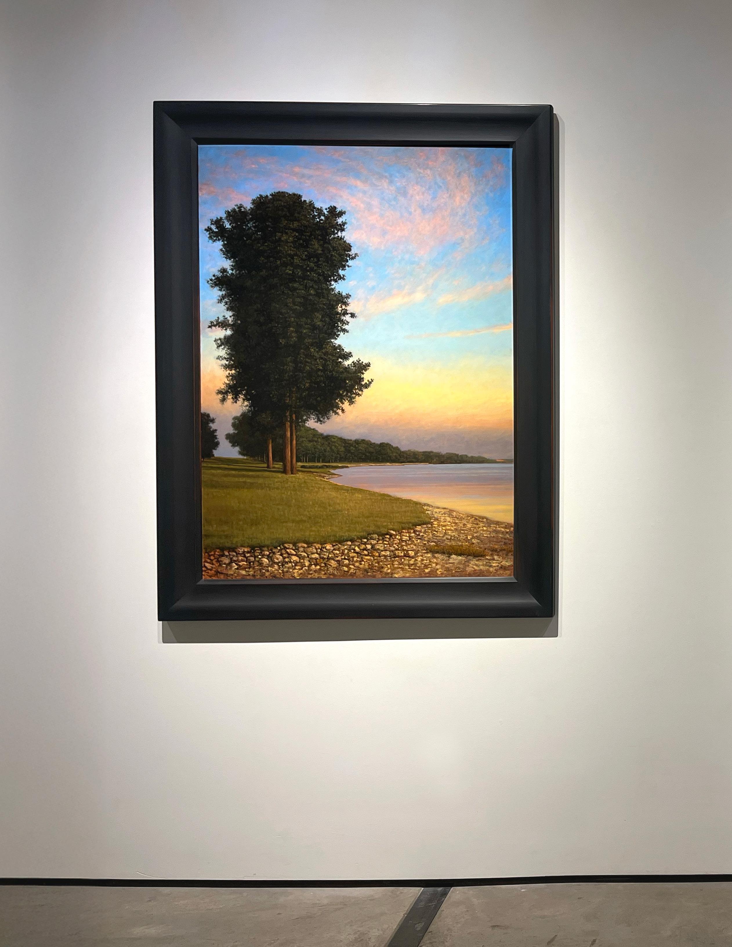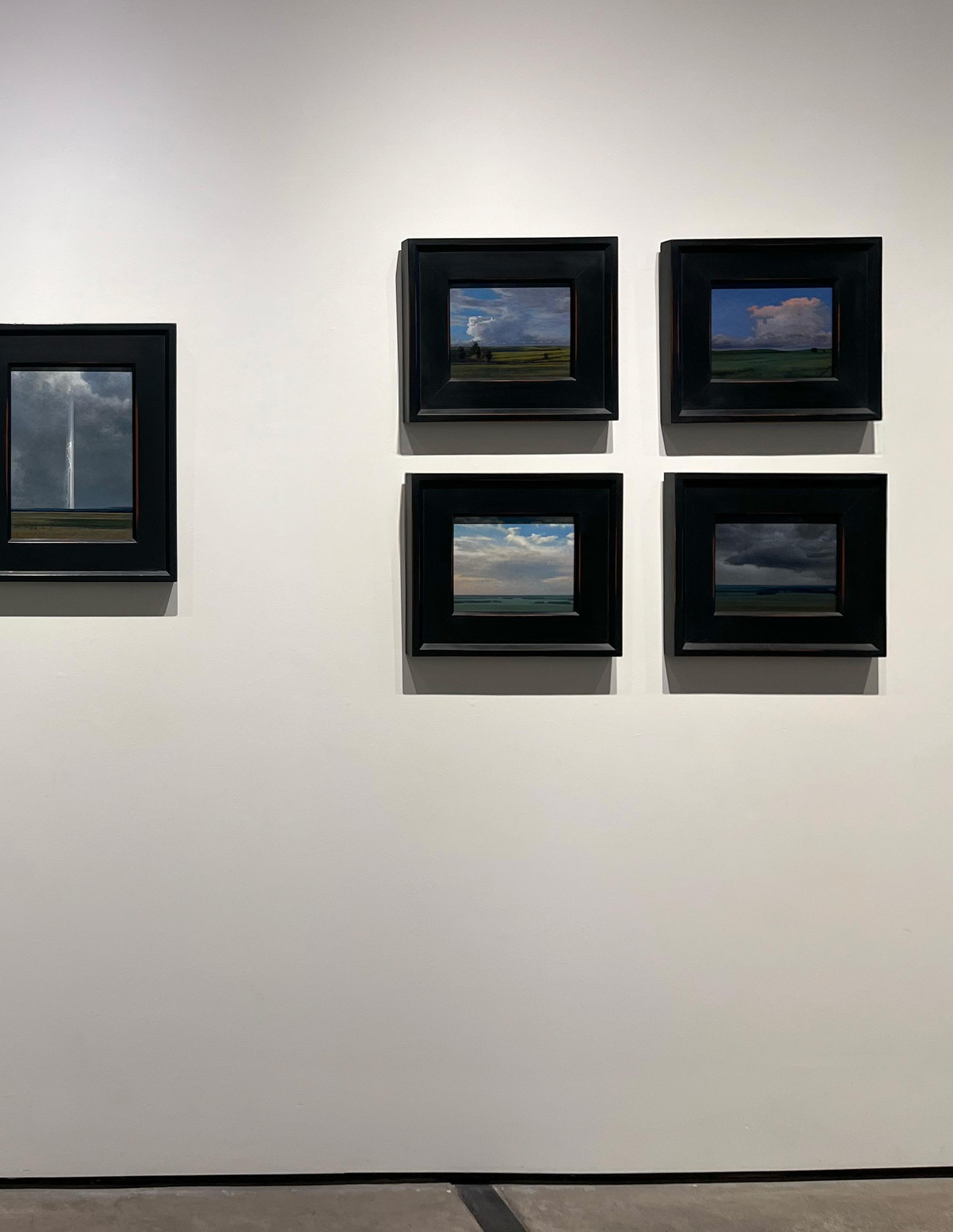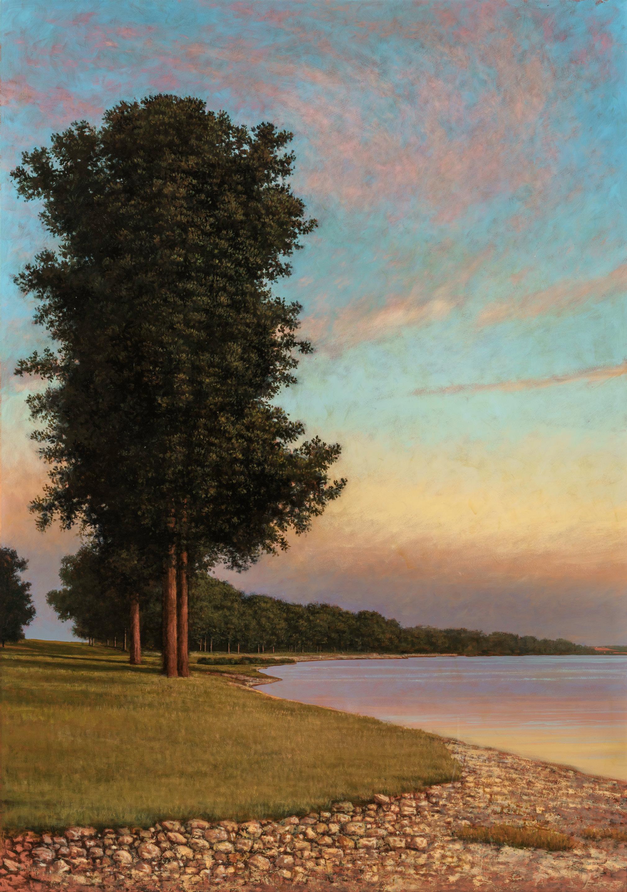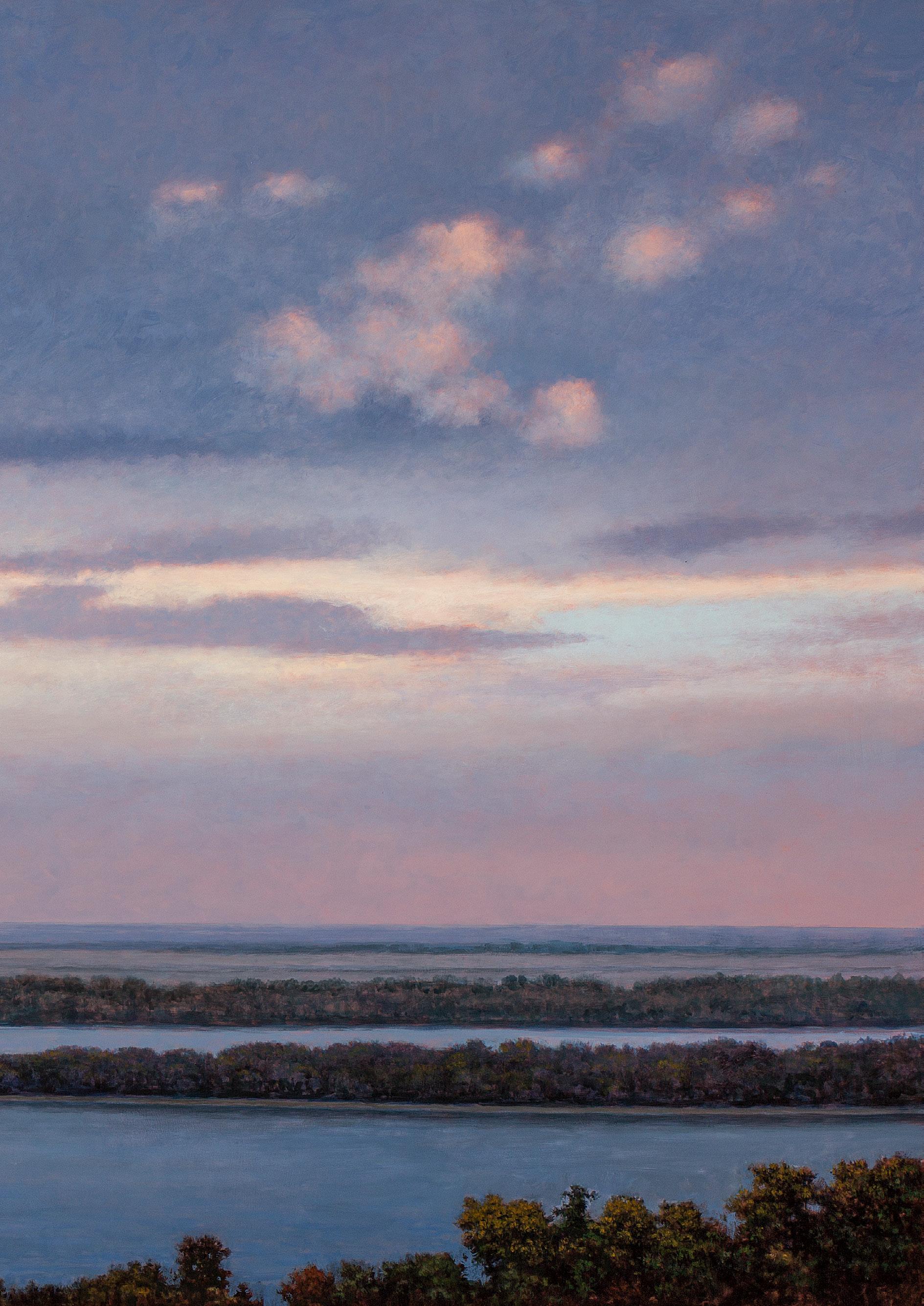 Jeff Aeling’s paintings seem to hold the actual experience of being present in the landscape. They are composed of the vastness of space and the shifting drama of light and atmosphere. The sky often fills over half of the composition and clouds frequently fill the sky. Sunlight and shadow are filtered and reflected on the land and water below to hold a single, unrepeatable moment in time.