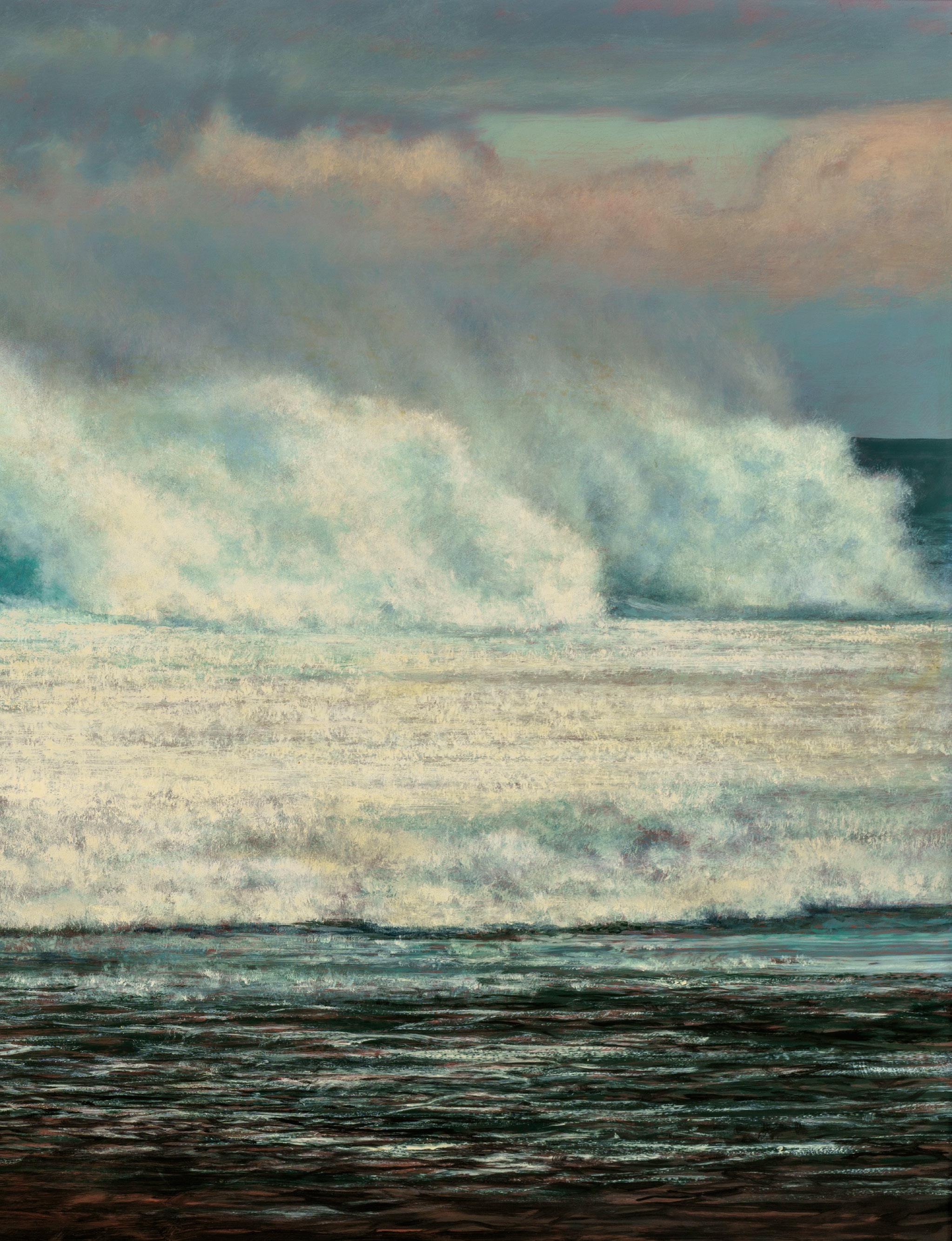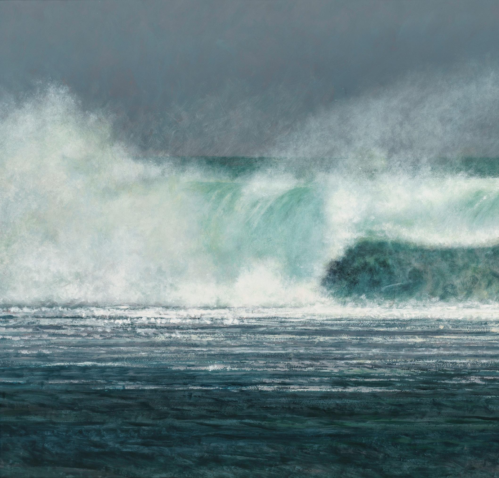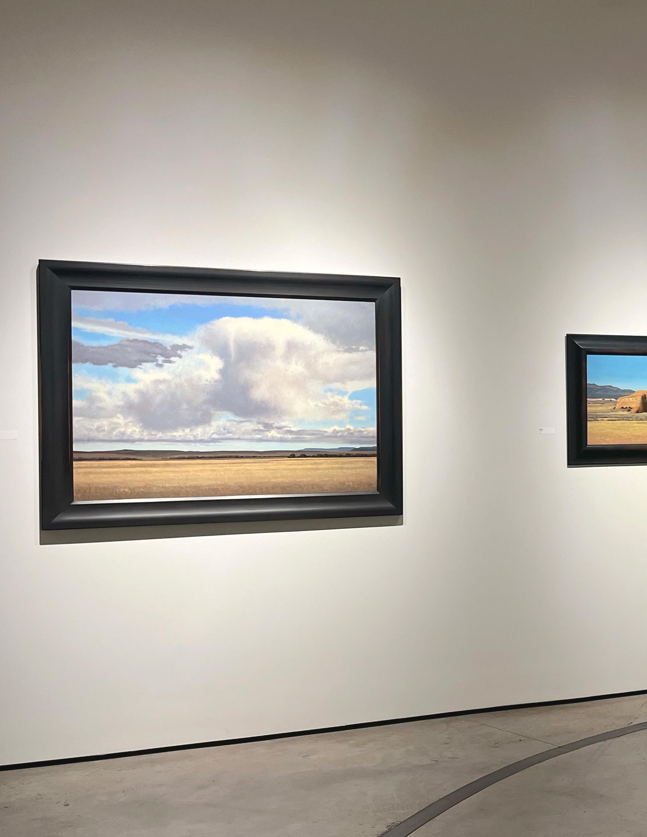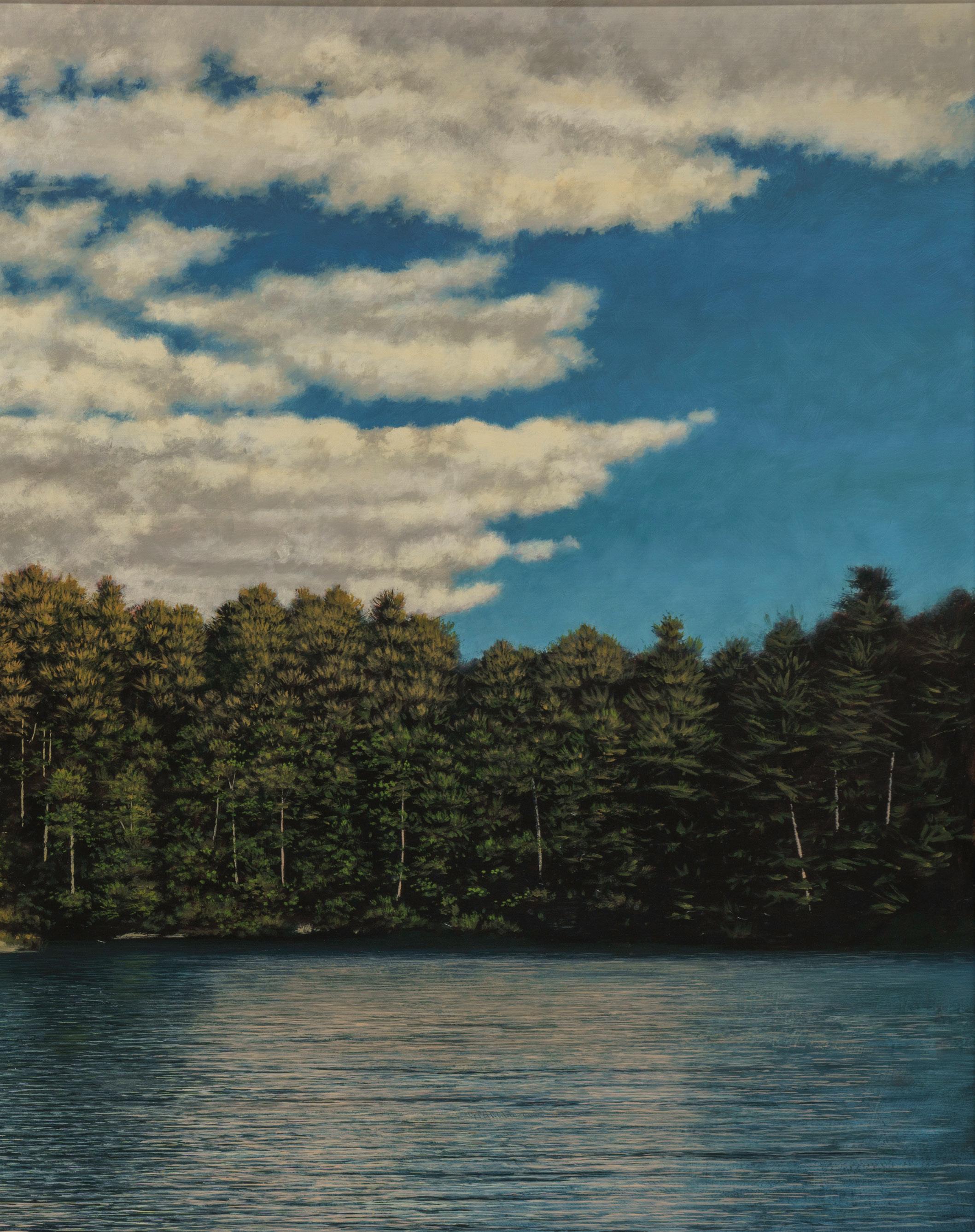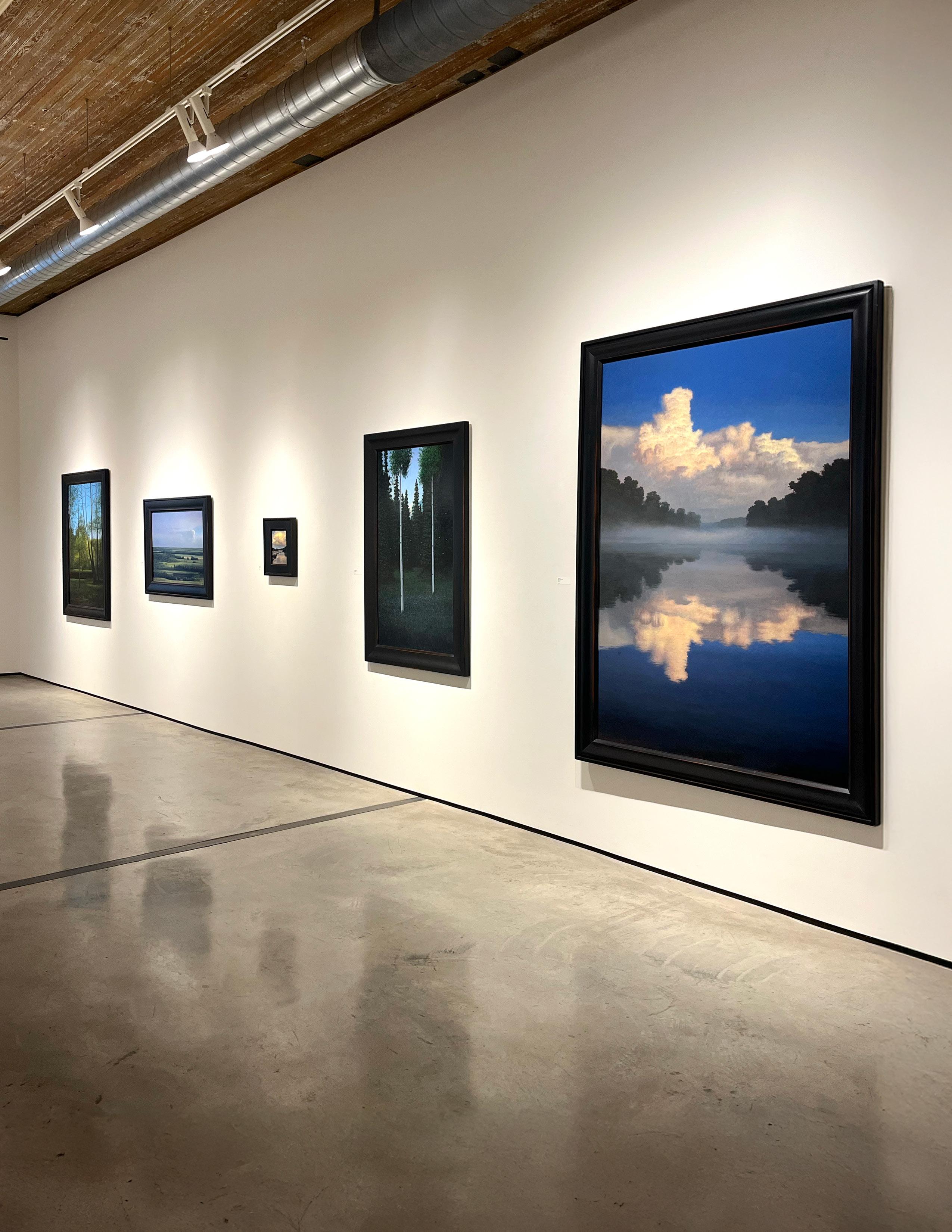 Jeff Aeling’s paintings seem to hold the actual experience of being present in the landscape. They are composed of the vastness of space and the shifting drama of light and atmosphere. The sky often fills over half of the composition and clouds frequently fill the sky. Sunlight and shadow are filtered and reflected on the land and water below to hold a single, unrepeatable moment in time.