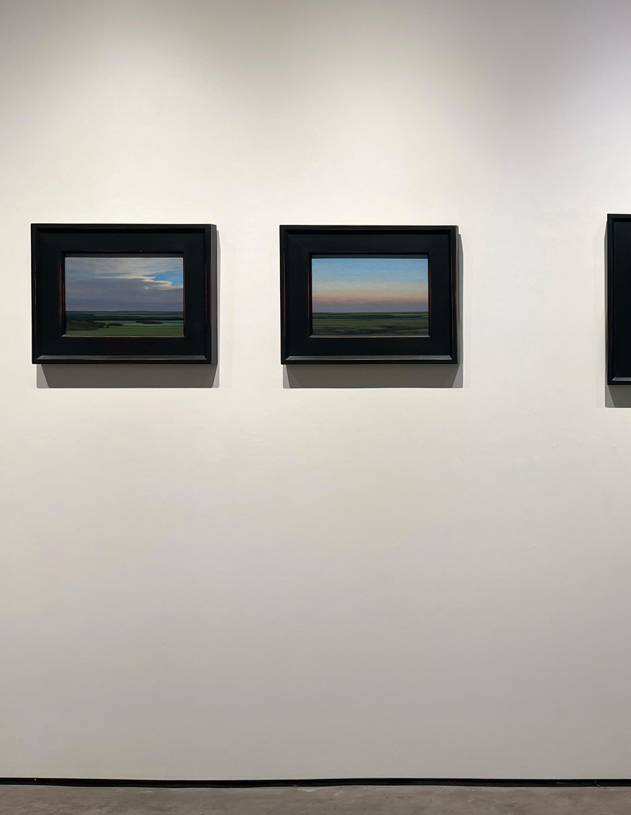 Aeling often traveled through the Flint Hills of Kansas, and the mountains of Colorado and New Mexico, to experience and photograph the landscape. He followed the sun and in the late hour of light, the golden hour, watched as the landscape transformed as the sun went down. He returned to the same places again and again, documenting subtle transformations. The numerous photos that he took became the source material for the paintings in the studio.