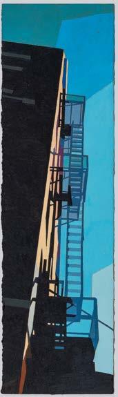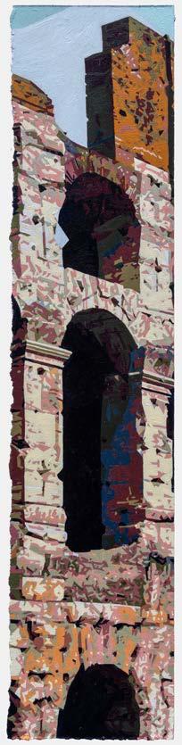 John Ferry’s recent paintings continue his lifelong inspiration and love of architecture and the built environment. The cities, that he has explored, from Detroit to Rome, are the catalyst for Ferry’s painted investigations of color, light, texture and space. Forgotten or overlooked urban spaces, such as alleyways or fire escapes, are shown in exaggerated vertical formats that express the very character of what is being depicted. This extreme format emphasizes the gesture of light and the narrow slice of sky between buildings emphasizes the tension of space in the city. Ferry’s use of format, as an essential design element, is equally successful in the long horizontal paintings of the mid-century modern Farnsworth house. Format and composition are paired in a variety of ways in the paintings of Rome. The Colosseum in Rome was the perfect subject to illustrate the grandeur and permanence of architecture shaped by the passage of time. In the Colosseum paintings, color and texture define light and shadow and the beauty of decay.