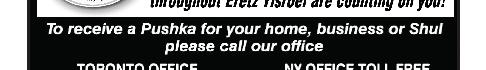 Hachnosas Orchim Gemach - quilts, pillows, linen, towels, hot plates, heaters, urns, negel vasser sets available for short term loan. Call Mrs. Leah Esther Fuhrer 416-787-2234 or Mrs. Frumie DʼAncona 416-780-1312.