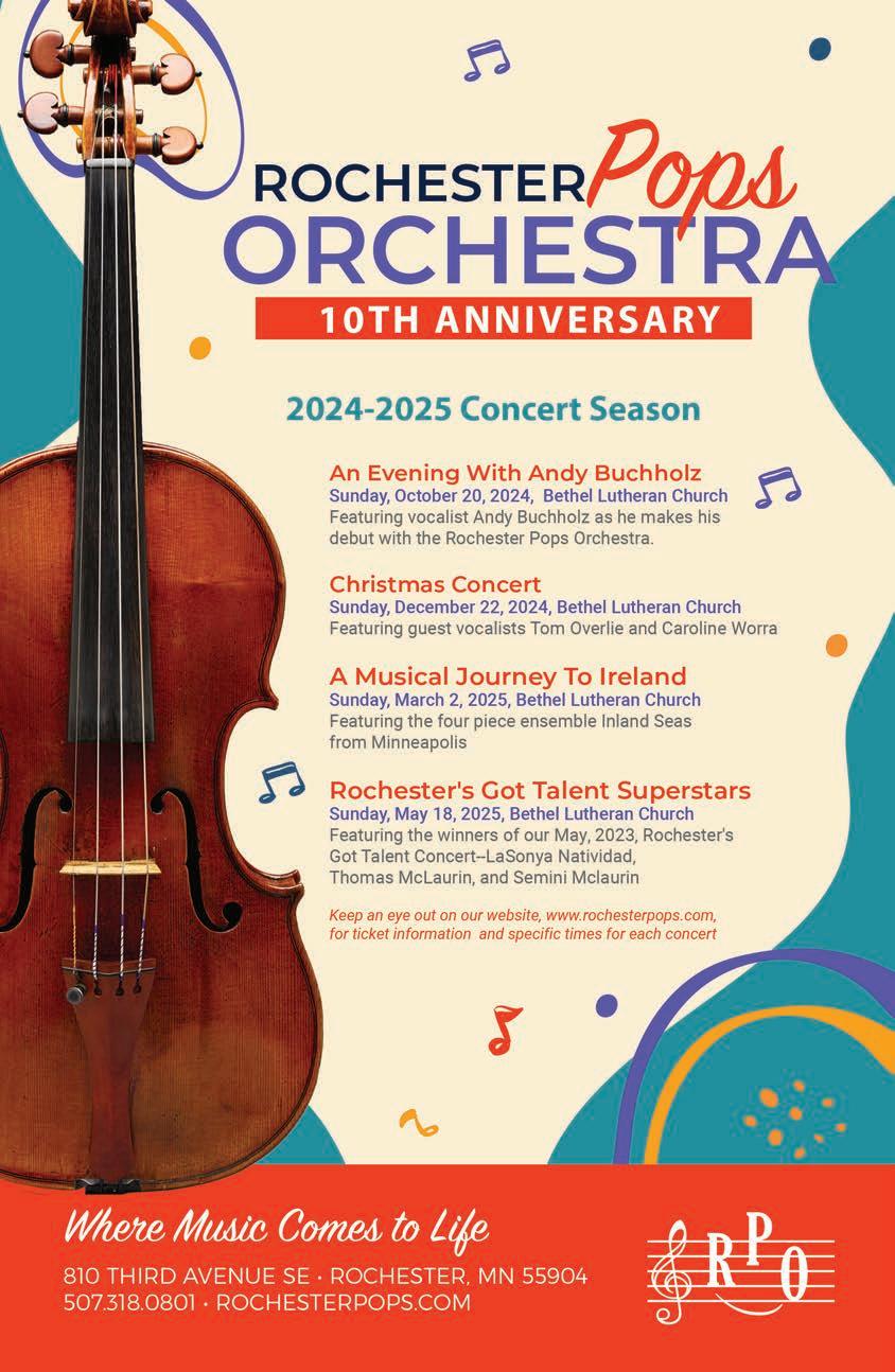 Rochester Symphony is a full orchestra and chorale ensemble. Concerts feature professional musicians playing classical repertoire, newly commissioned music and popular selections. Six full concerts as well as small ensembles and educational events throughout the season provide music access to a wide variety of audiences.