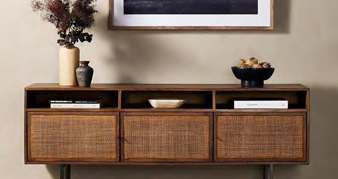 Iron Base Media Console is 65 inches wide with rear cutouts for cord management.
