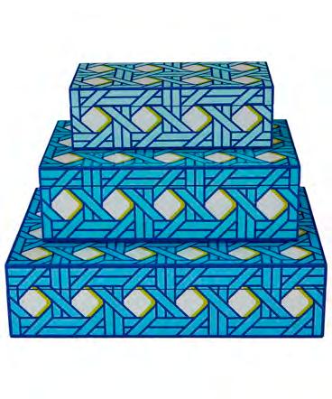 These velvet-lined basketweave lacquer boxes in cool blue with a lime green accent are a posh tidying addition to your shelf, mantel, or tablescape. $360 - set, jonathanadler.com