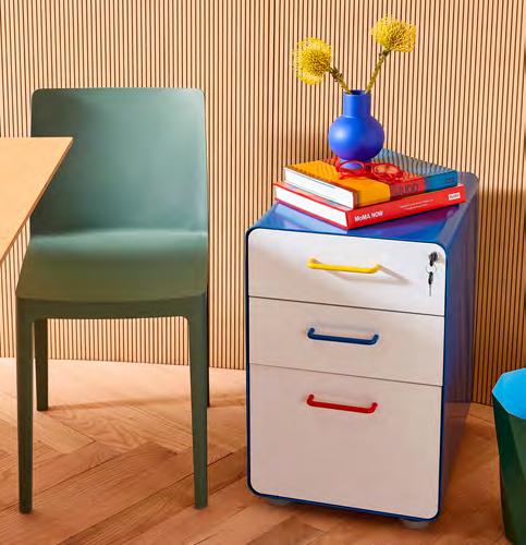 The Poppin Stow 3-Drawer File Cabinet features customcolor hand pulls that match the drawers’ interiors, a large hanging file bottom drawer, and two drawers with adjustable dividers for office essentials. $399 moma.org