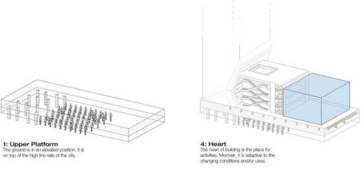 Flexible space to adapt- parking and service Centre top could be stage and temporary exhibition, amphethetre seating for different events.