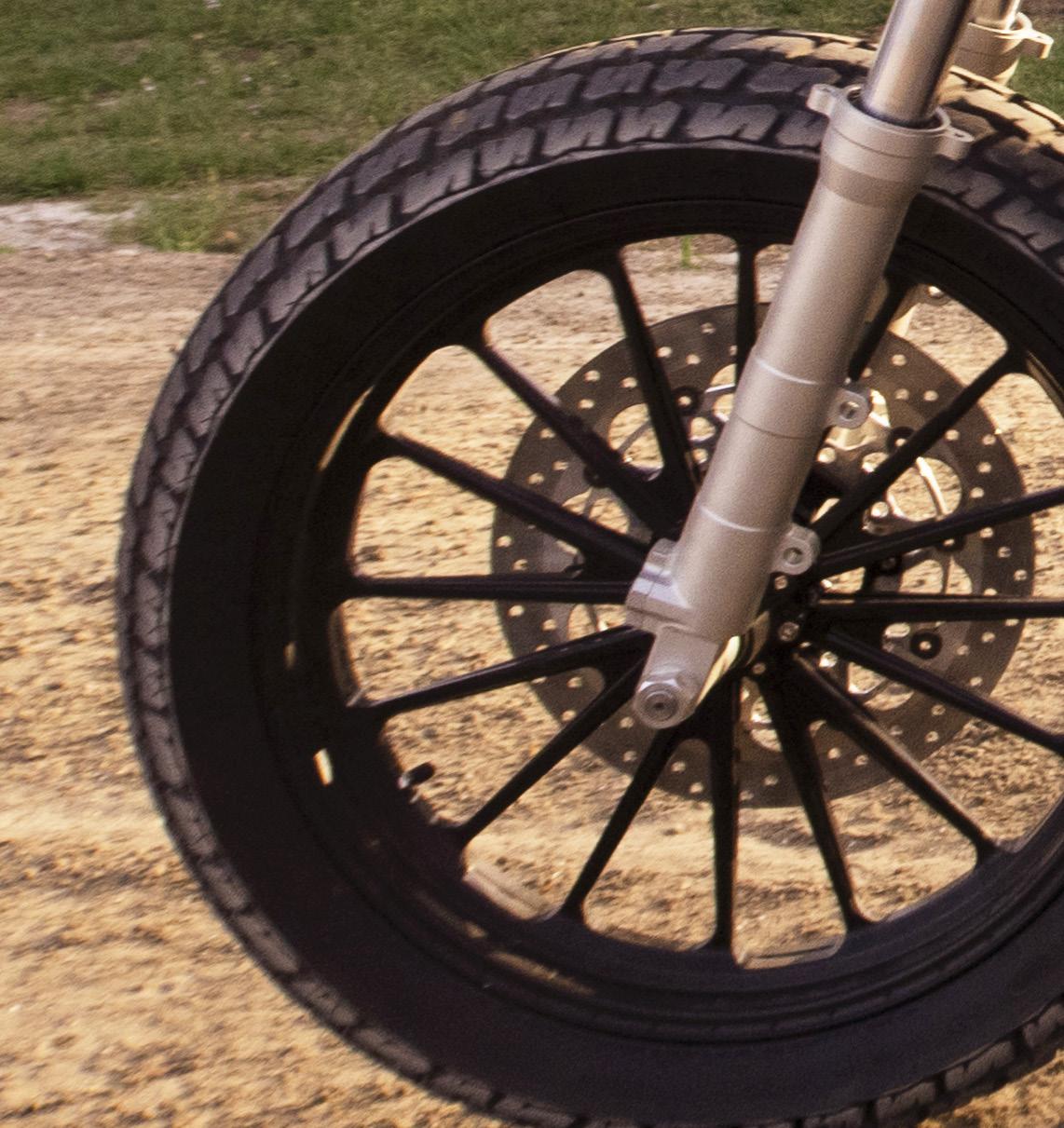 The beginning of the 2017/18 winter indoor racing season brought more changes. Now, 19in wheels made it more official; a Borrani laced to the stock MX250 front hub and an Akront to a Barnes quick-change rear. The rear hub, fitted with a disc, required a new brake set-up, acquired after fruitful rummaging in the bins at Cycle Heap yielded the Brembo caliper still in use today, plus a master cylinder, brake line and foot control lever. It was about this time that Korry retired the homemade seat