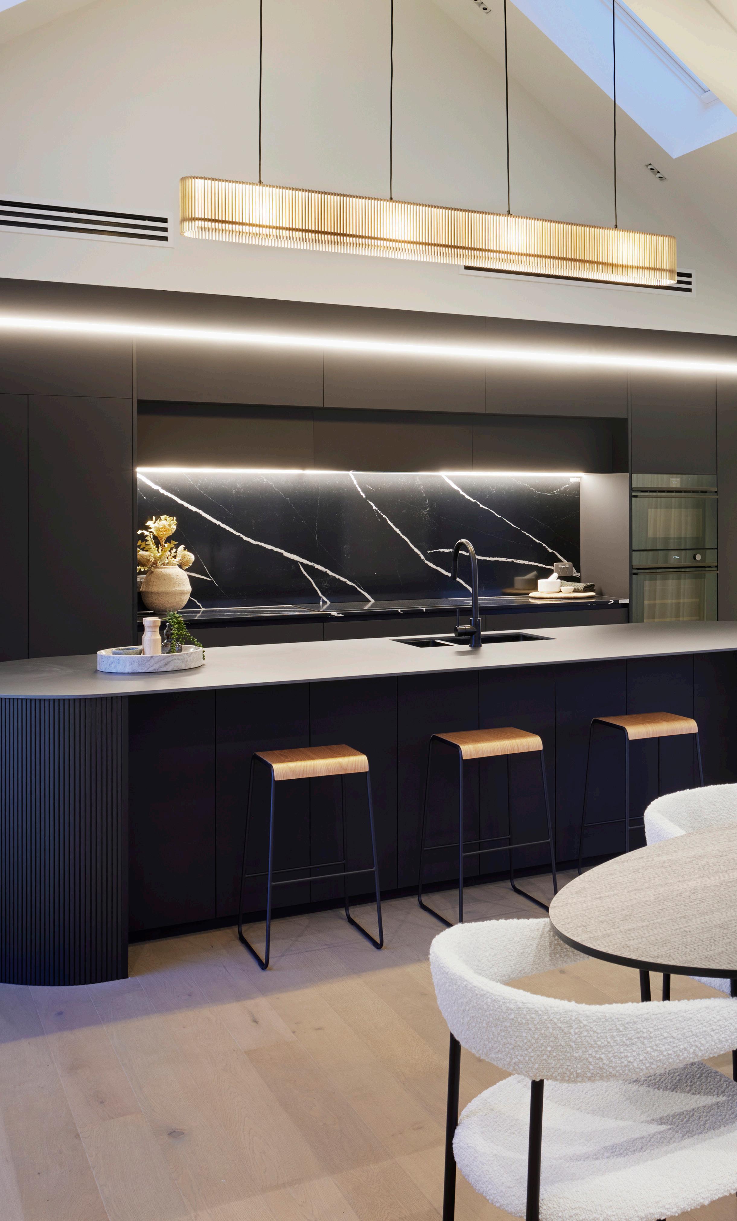 The kitchen space is adorned with elegant curves that soften the sharp angles of the raked ceiling.