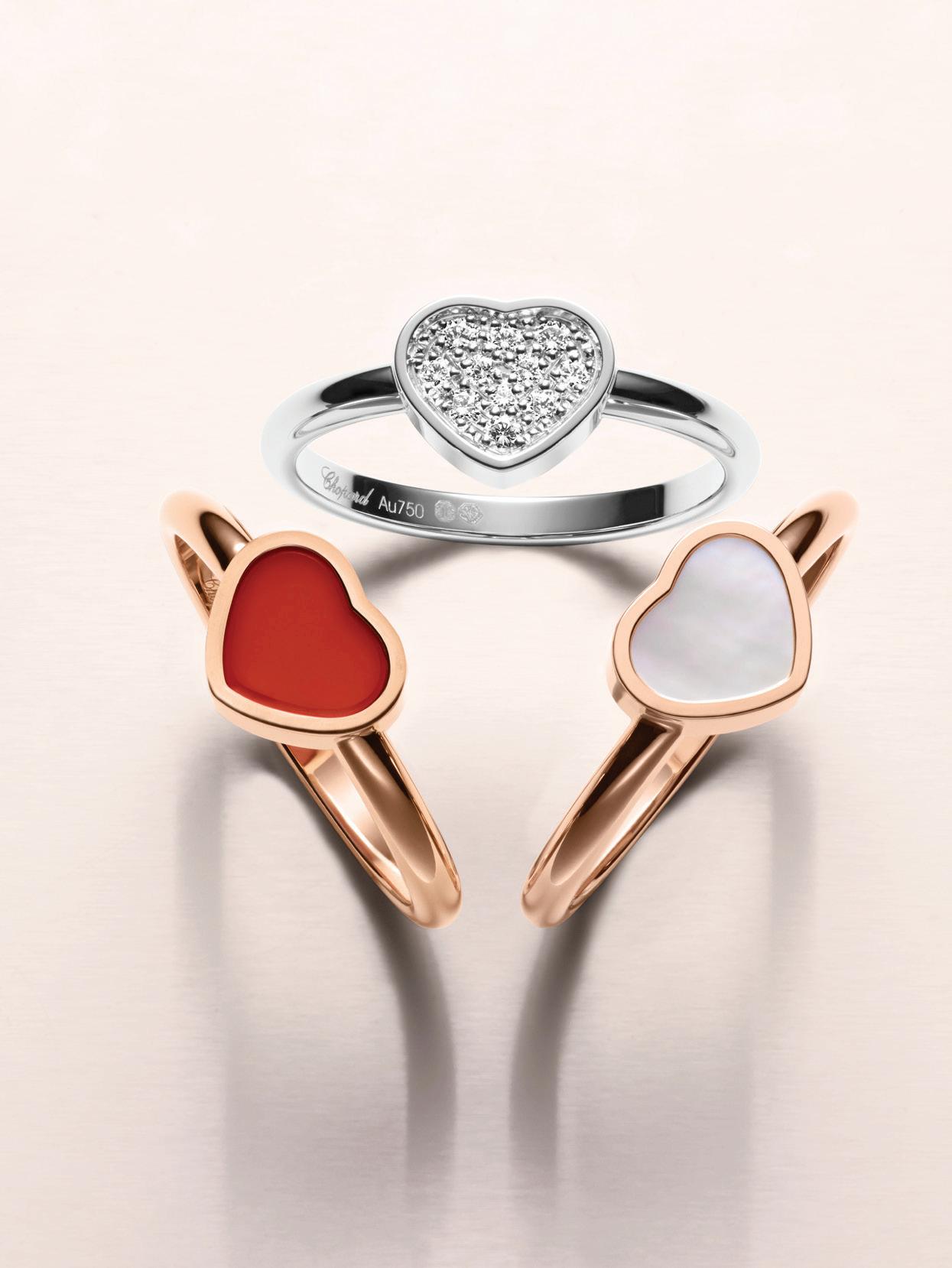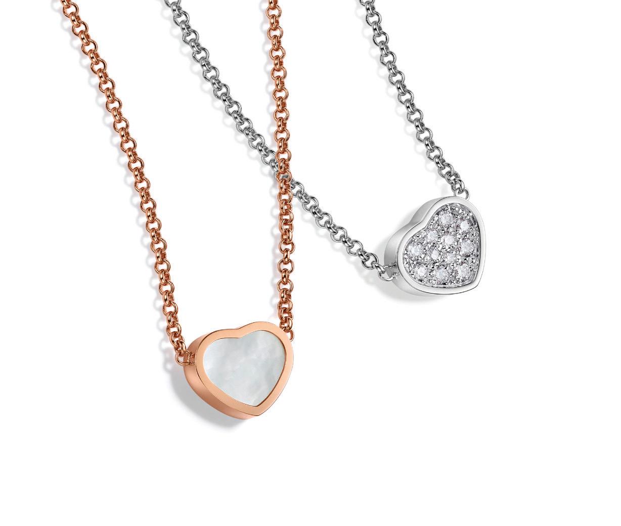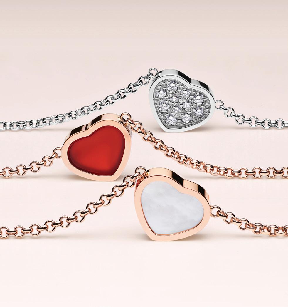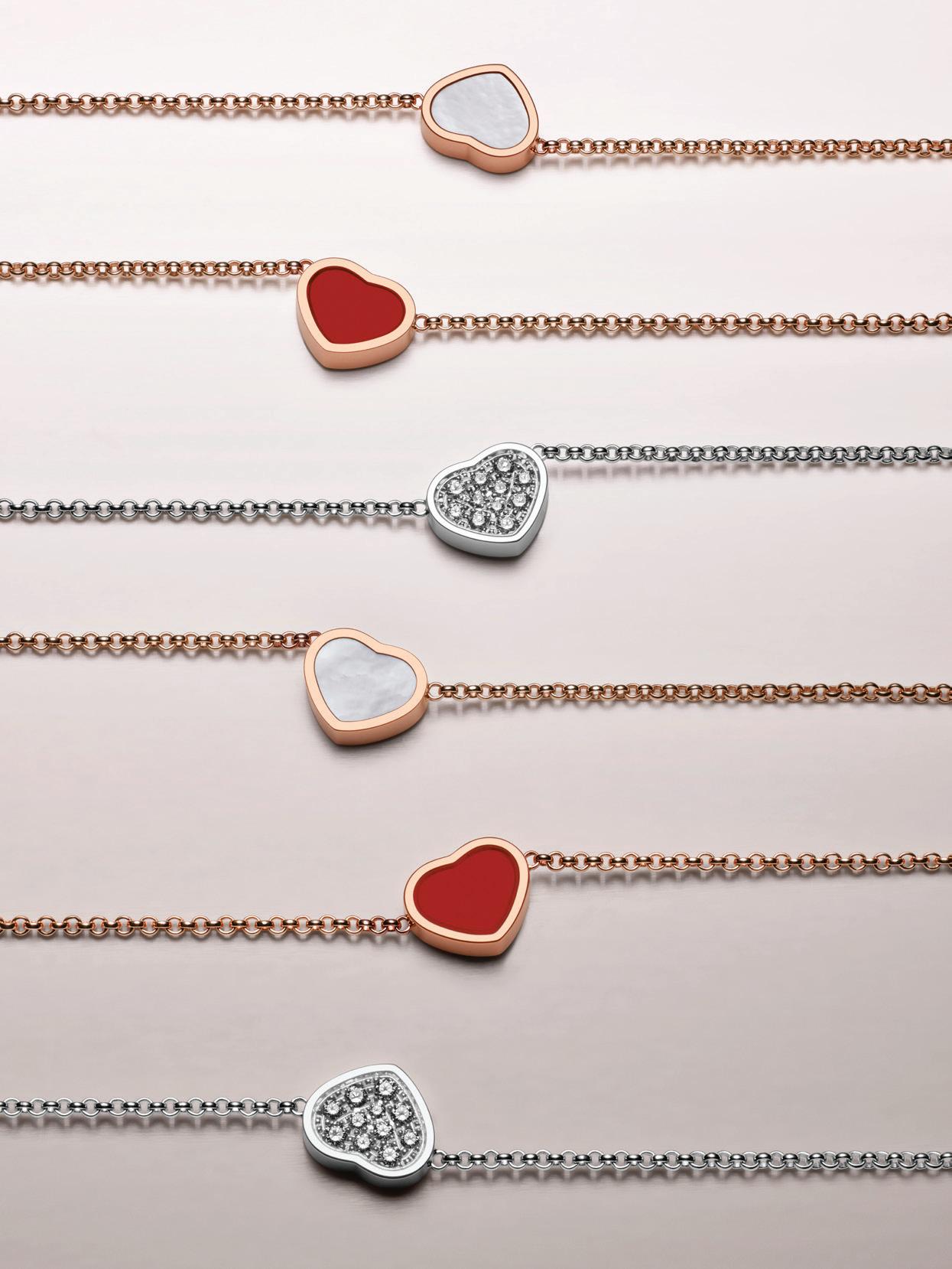 My Happy Hearts collection includes necklaces, chain bracelets, rings and earrings centred on the single heart motif. While the body may be in either “ethical” 18-carat rose or white gold, the literal heart of each piece of jewellery in this collection is in carnelian, mother-of-pearl or diamond-set versions.