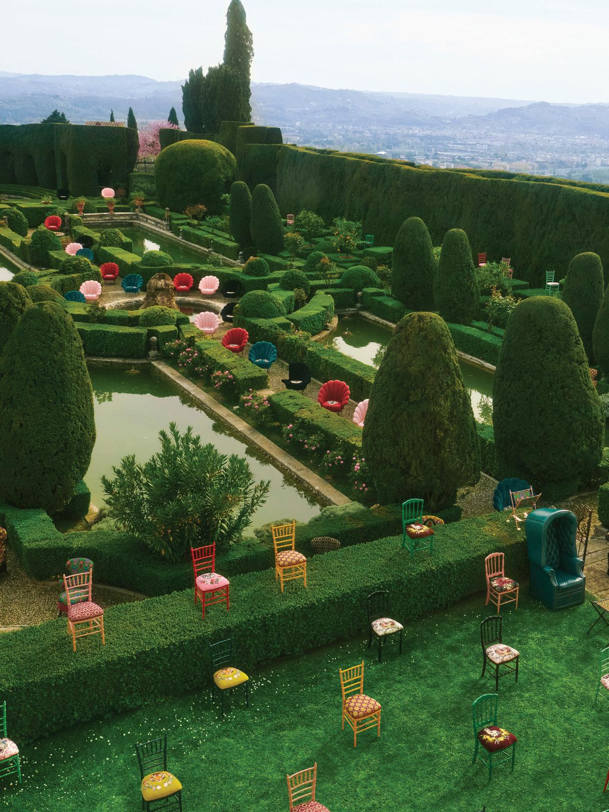 In a campaign conceived by Alessandro Michele, photographer and art director Max Siedentopf has created a light-hearted landscape by situating the new Gucci Décor items within the pristine setting of a topiary garden.